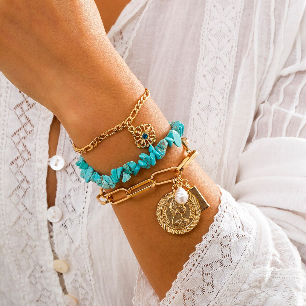 Punk Toggle Bracelets Set : Green Stone Chain Bracelets