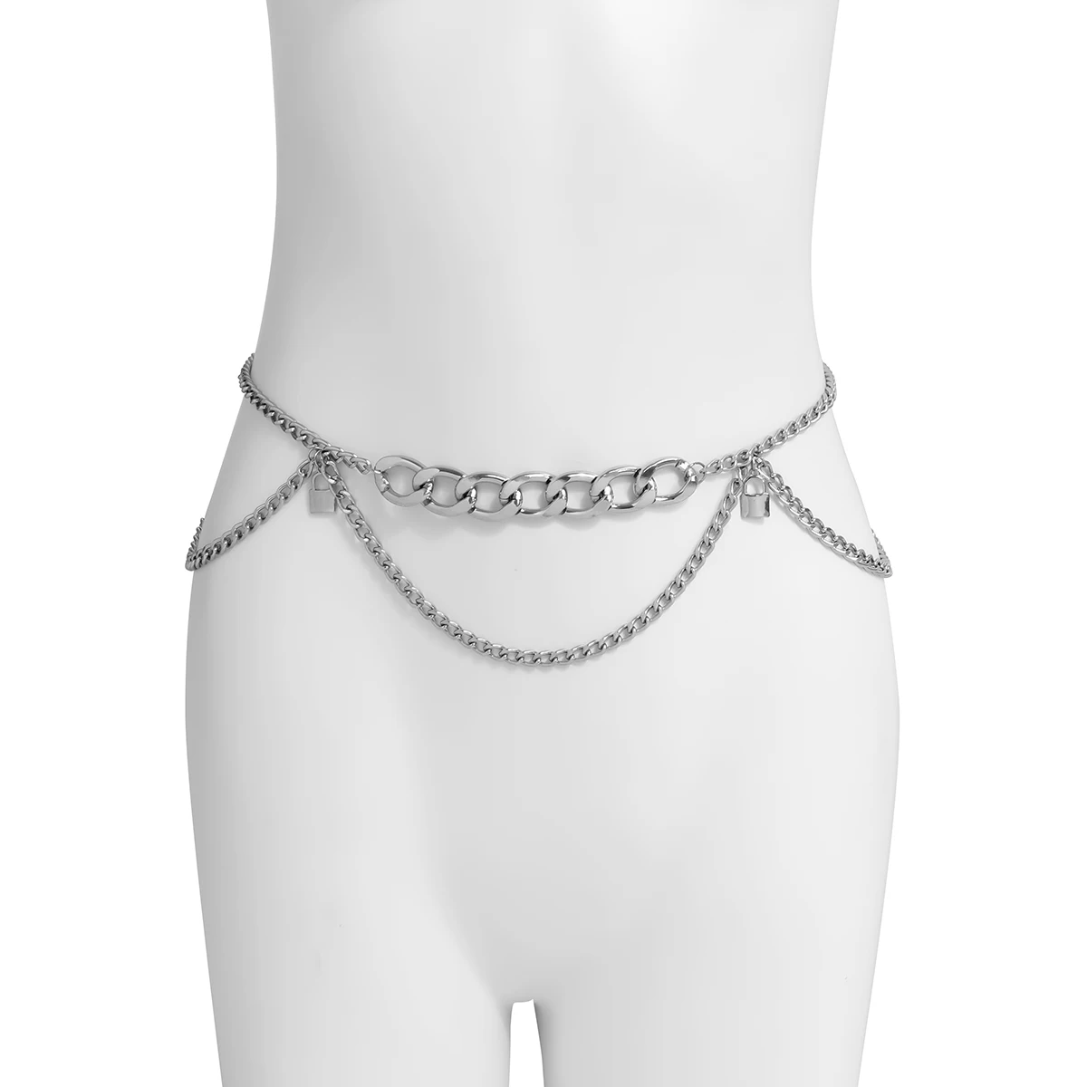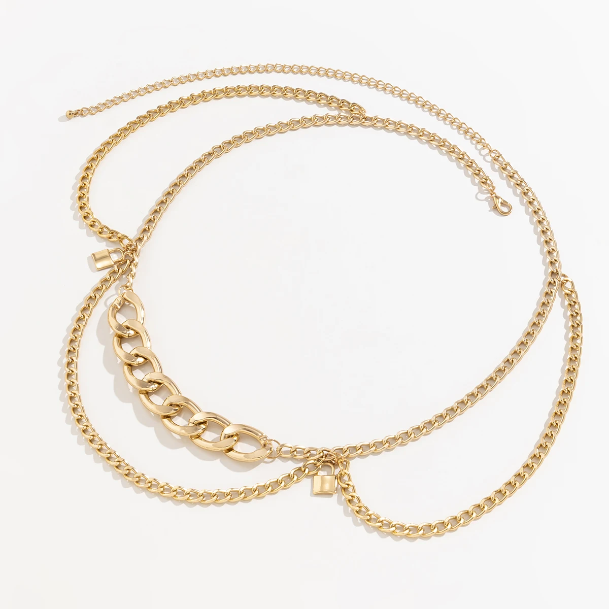 IngeSight.Z Punk Lock Pendant Chunky Thick Waist Chain for Women Multilayer Gothic Gold Color Cuban Chain Dress Waistband Belts