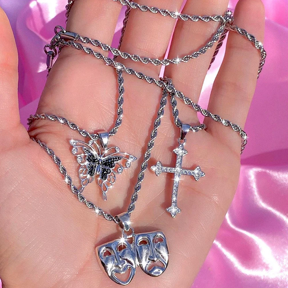 ins Hip-hop Metal Rhinestone Cross Pendant Necklace Punk Gothic Crying Smiley Face Necklaces For Women Jewelry Gift