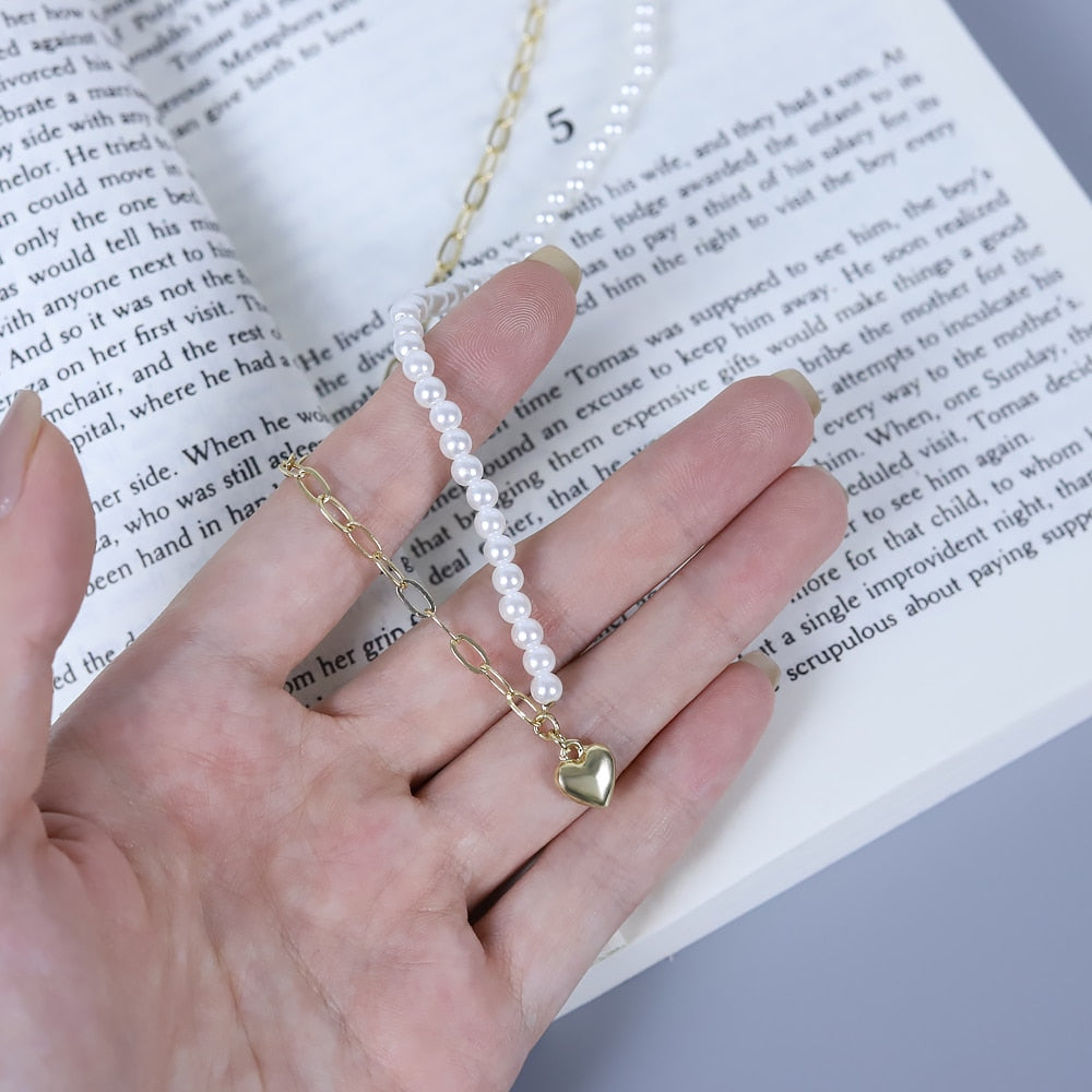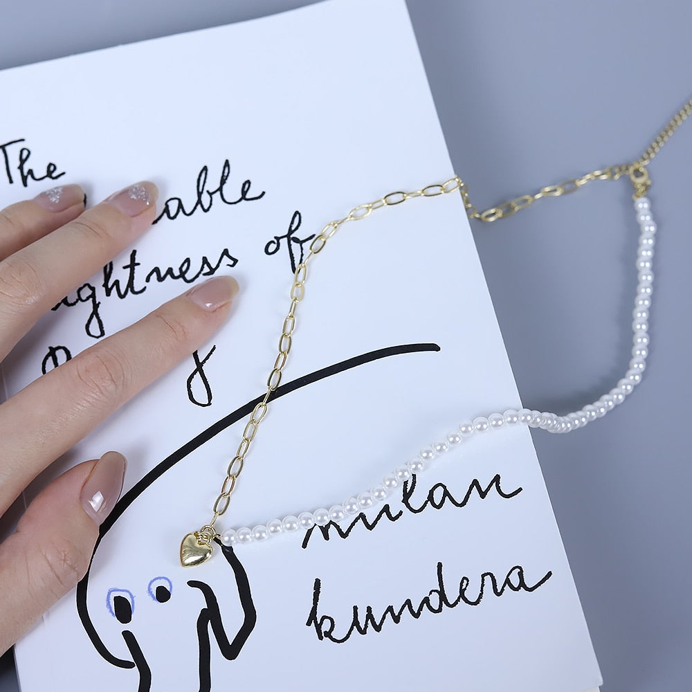 Japan and Korea Pearl Love Pendant Necklace Simple Trendy Asymmetric Clavicle Chain Punk Choker Necklace Woman Jewelry Gift