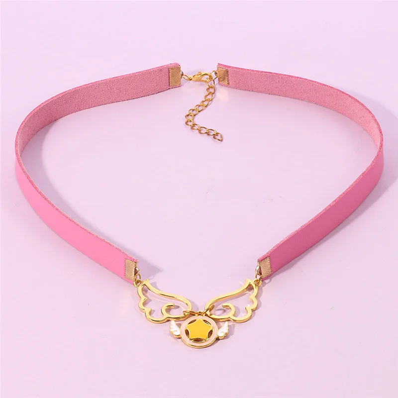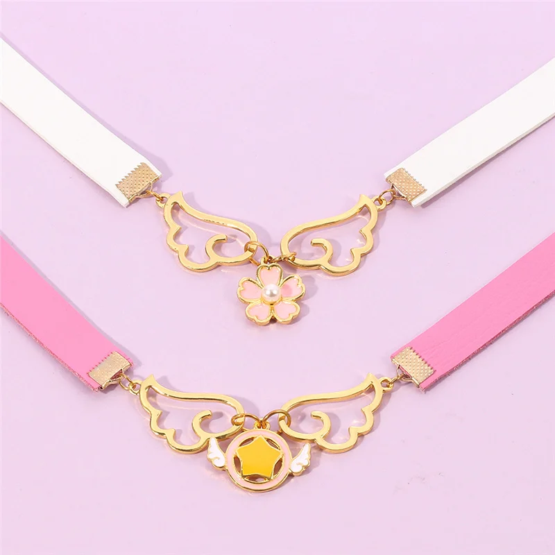 Japan Anime Choker Necklace Two Color Magic Card Cherry Wing Five-Pointed Star Pink Collar Necklace Beautiful Accessories