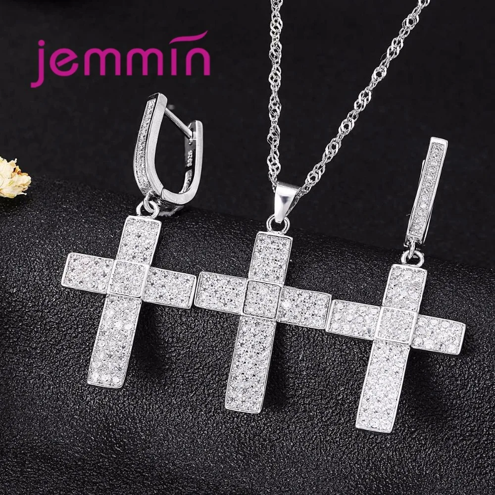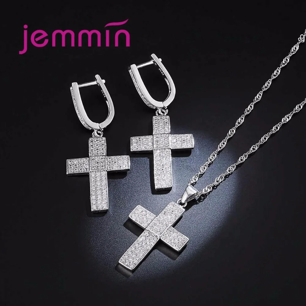Classic Cross 925 Sterling Silver Rhinestone Pendants Necklaces Earrings Set Women Bridal Wedding Jewelry Sets Accessory