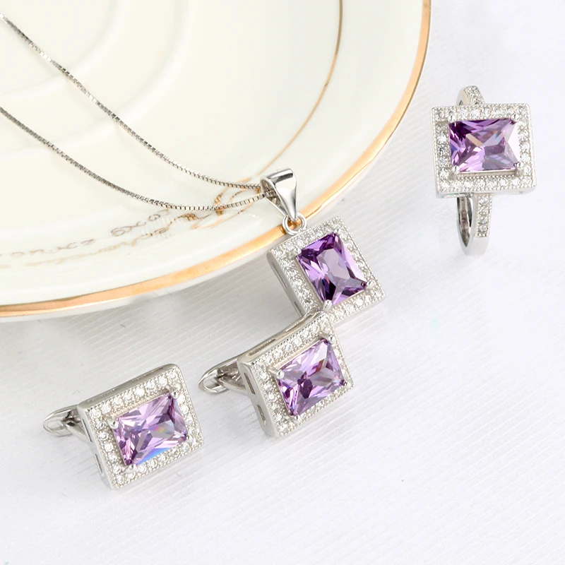 JOVO 925 Sterling Silver Necklace and Stud Earrings rings Jewelry Sets for Women square AAA Zircon Vintage party ladies gift