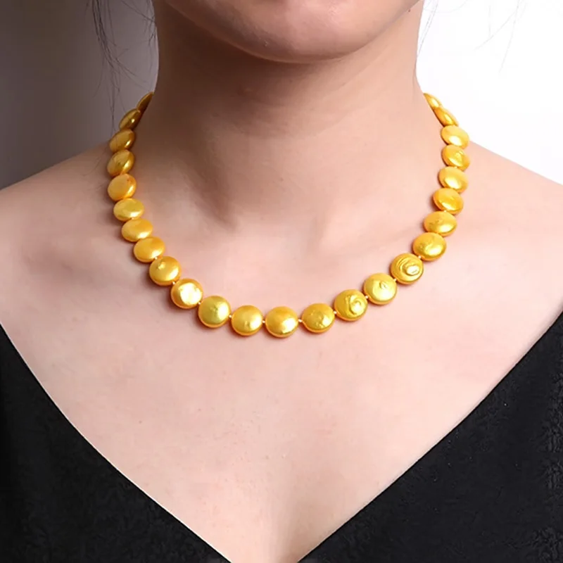 Classic 12-13mm Yellow Button Pearl Necklace Gift AAA 17.5 inches