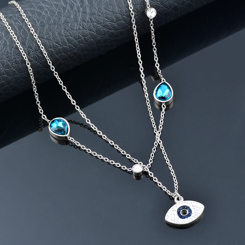KIOOZOL Lucky Evil Blue Eyes with CZ Teardrop Stainless Steel Double Layers Necklace for Women Jewelry 332 KO2