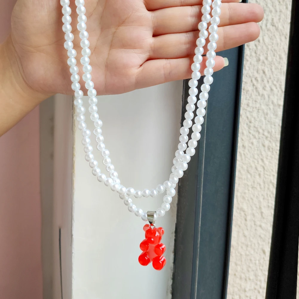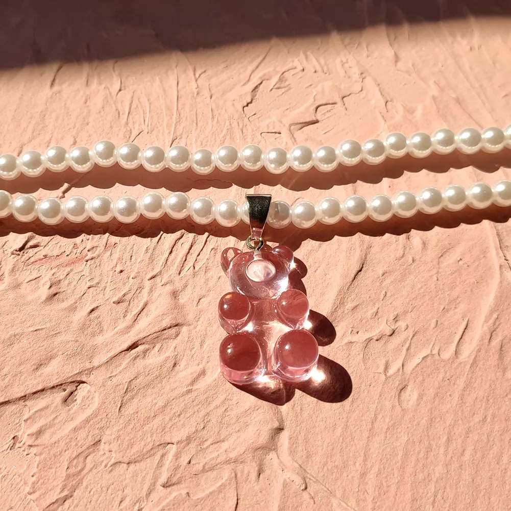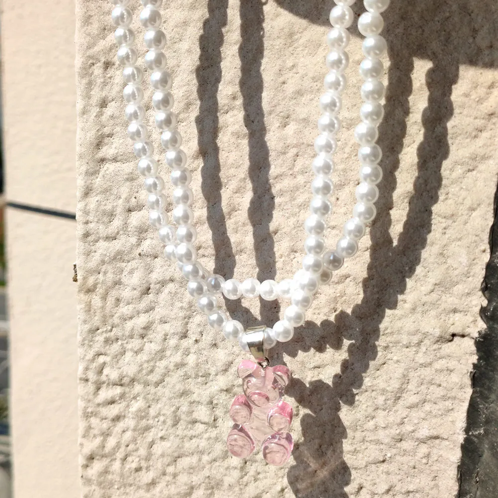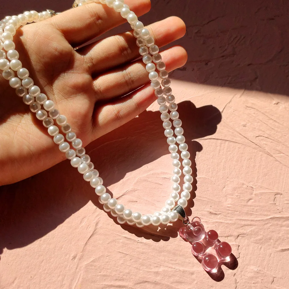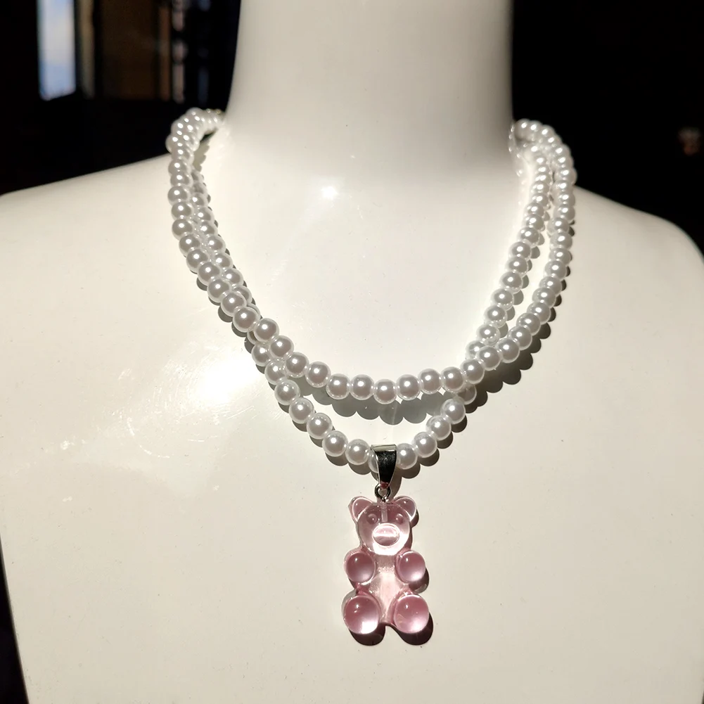 Korea Transparent Resin Bear Double Layered Pearl Beaded Necklace For Women Candy Gummy Bear String Bead Choker Girl Y2K Jewelry