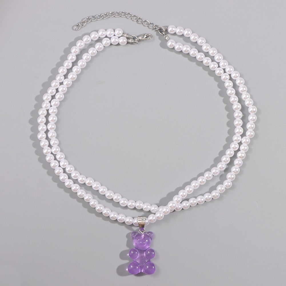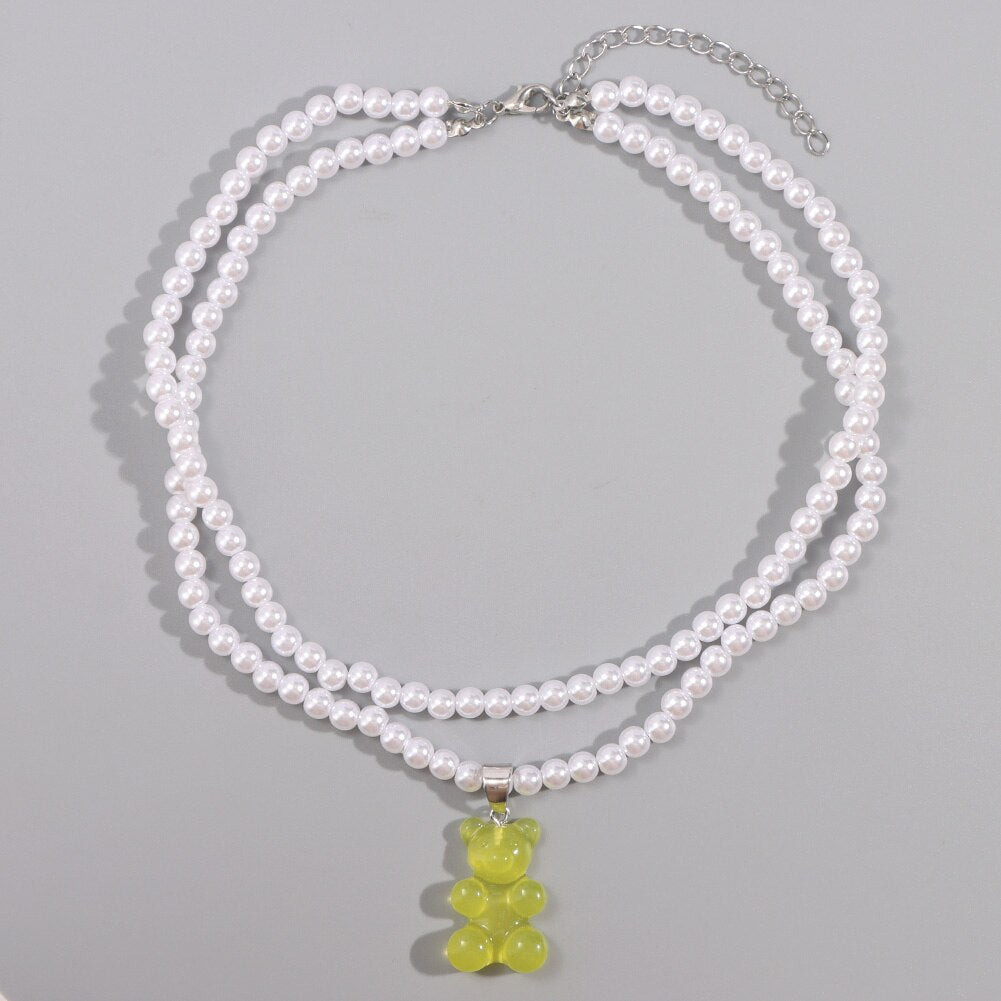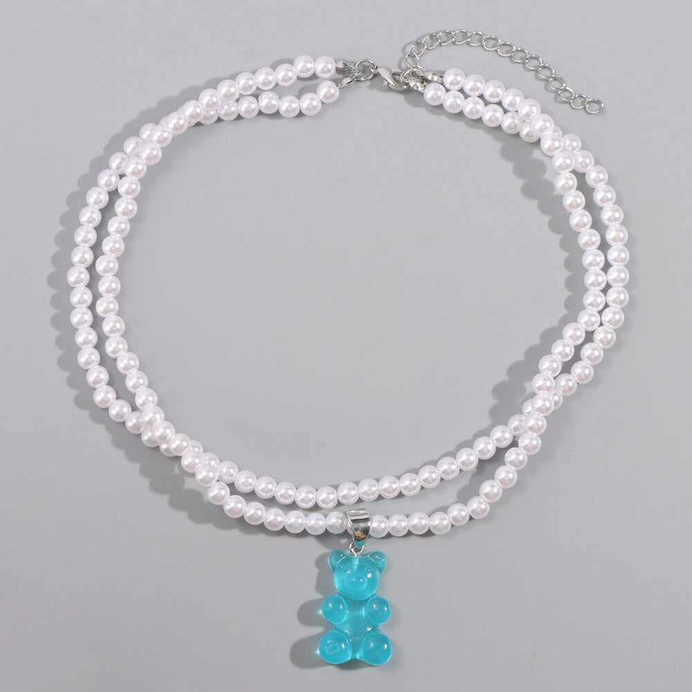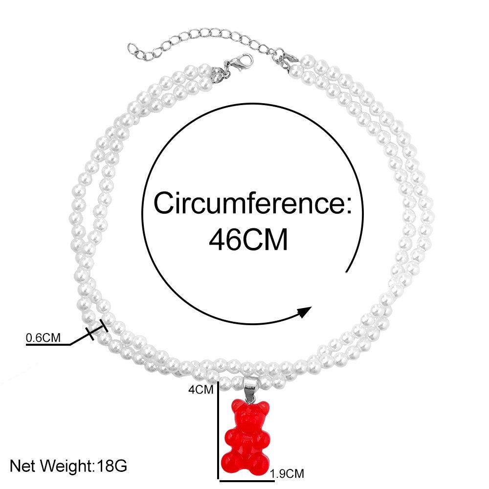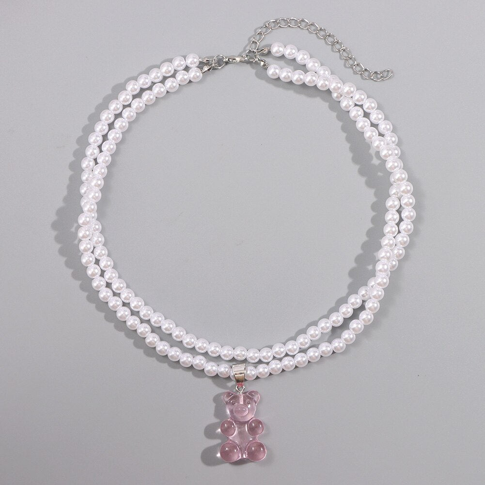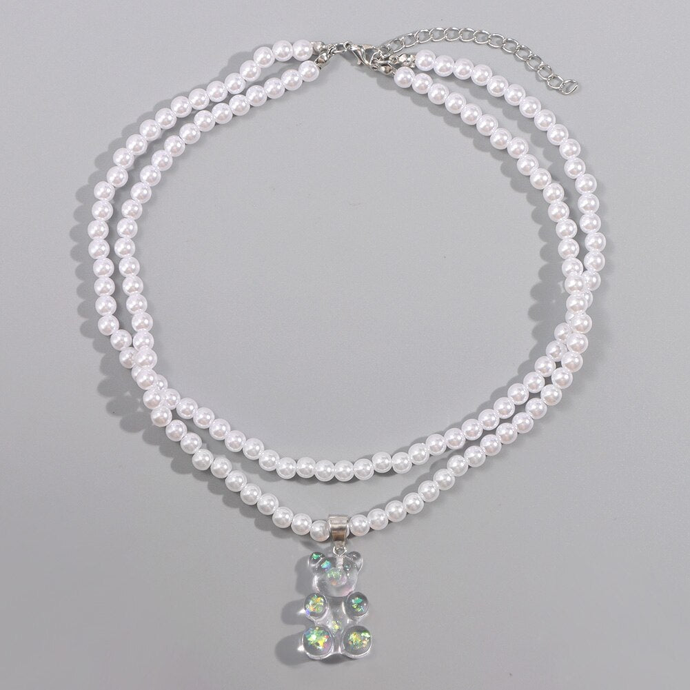 Korea Transparent Resin Bear Double Layered Pearl Beaded Necklace For Women Candy Gummy Bear String Bead Choker Girl Y2K Jewelry
