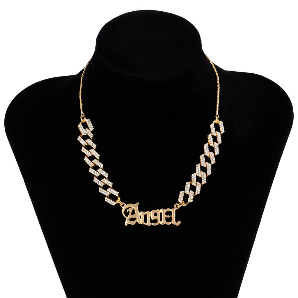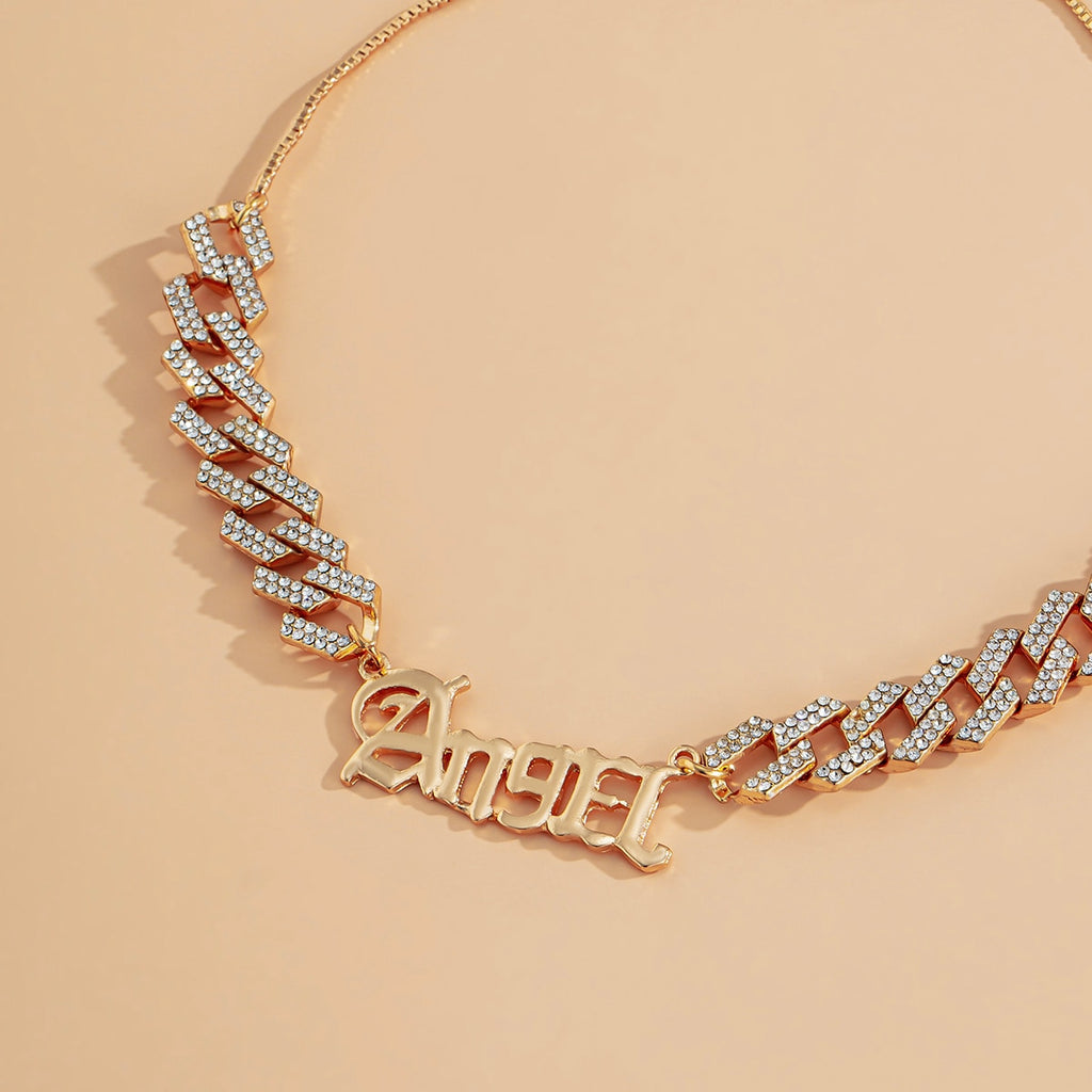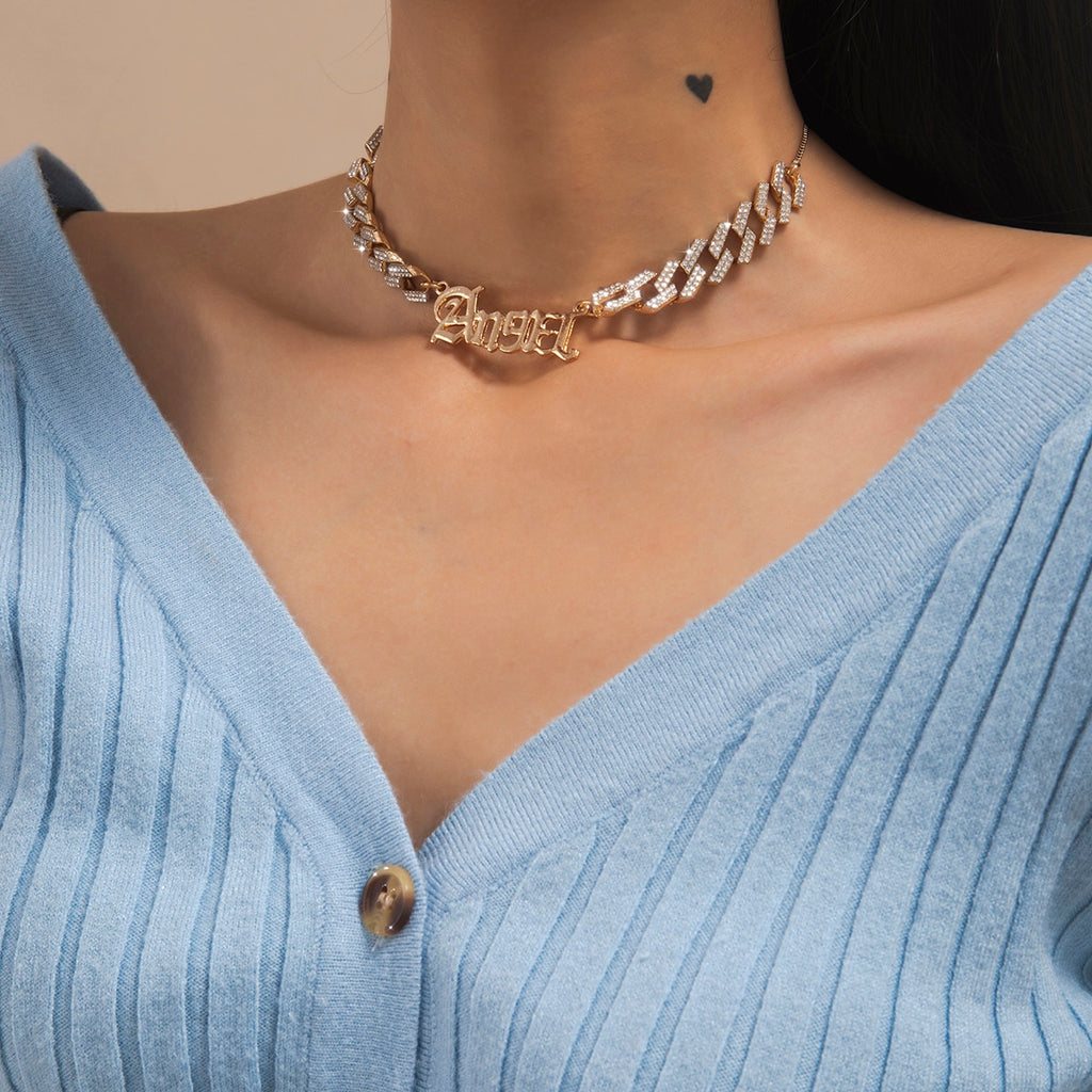 KunJoe Angel Necklace for Women Girls Old English Font Pendants Necklaces Letter Choker Rhinestone Chain Statement Jewelry
