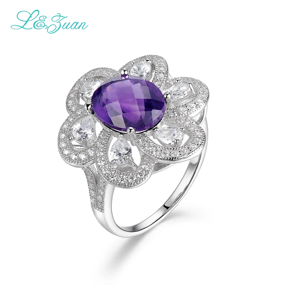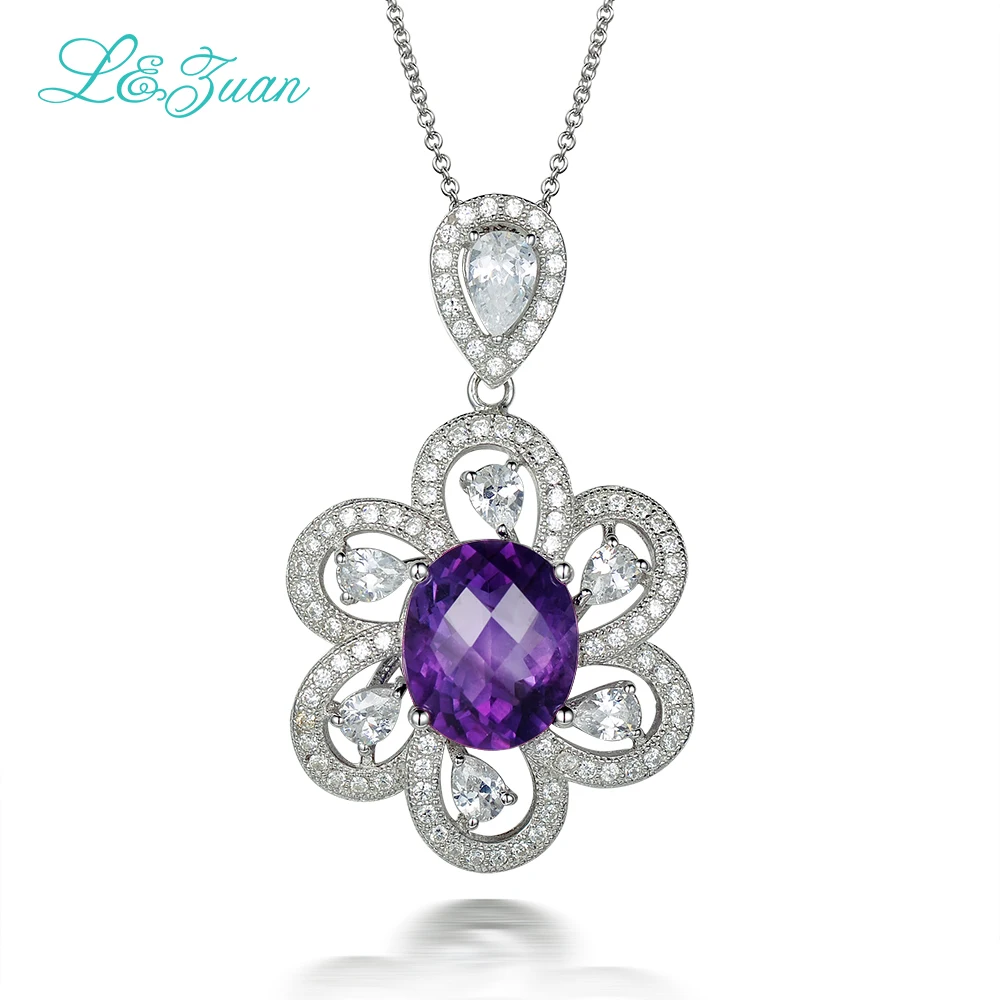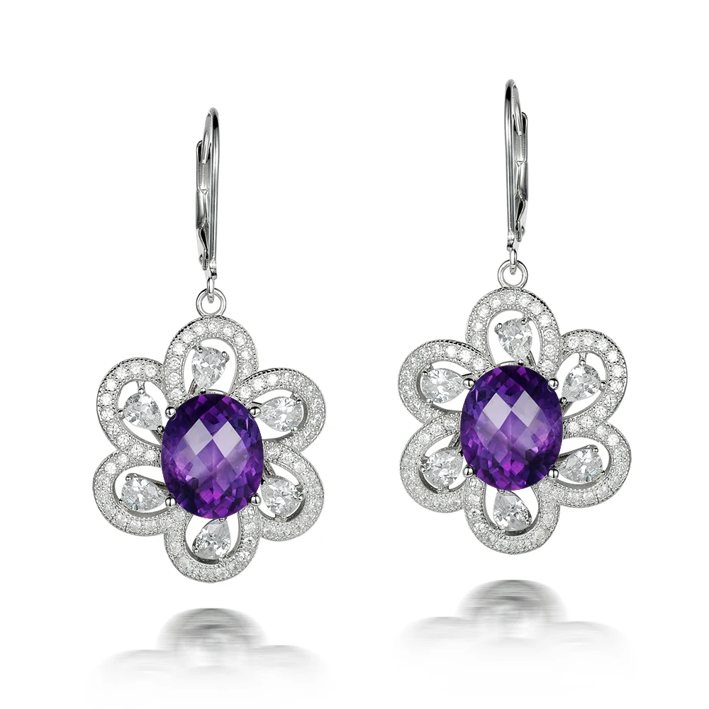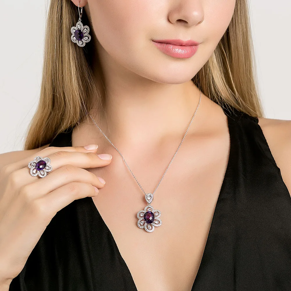 925 Silver Woman Jewelry Set Trendy Flower Natural Luxury 7.25ct Amethyst Pendant & 7.02ct Earrings & 7.05ct Ring