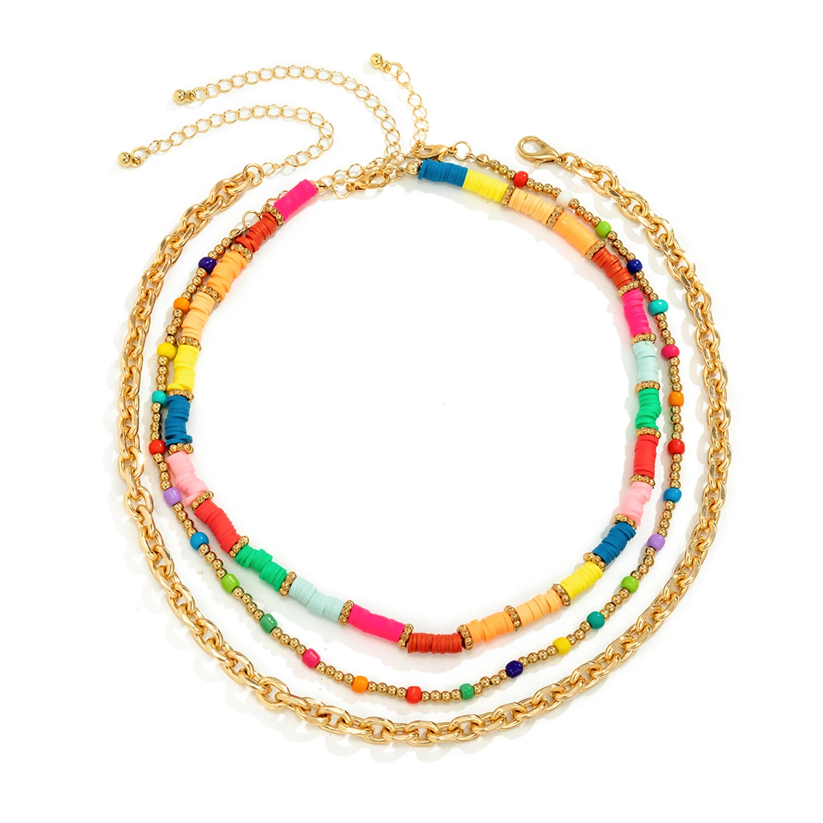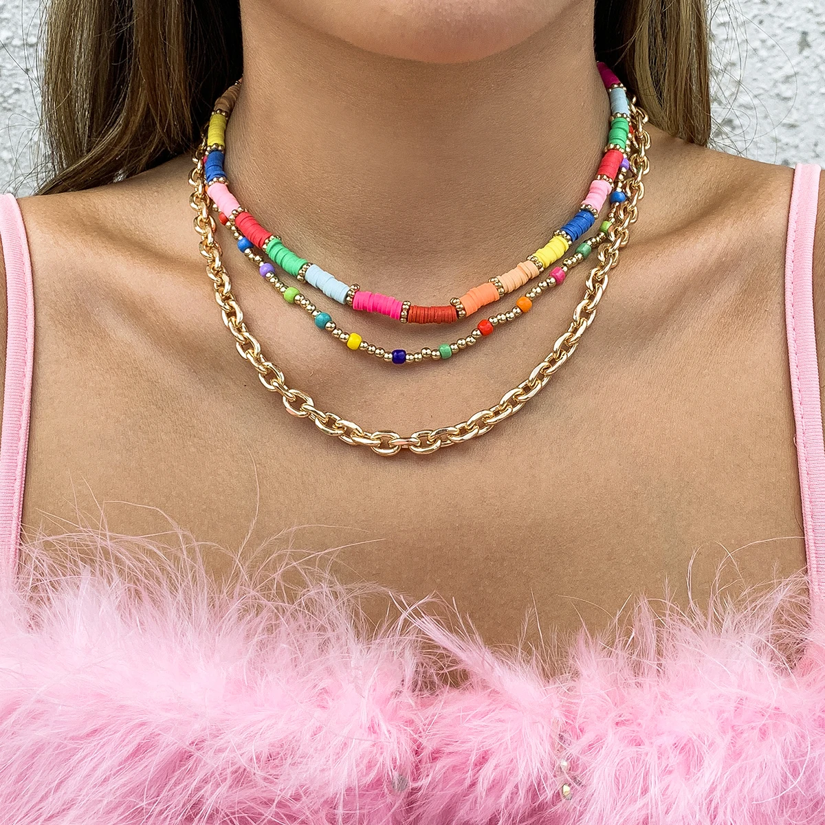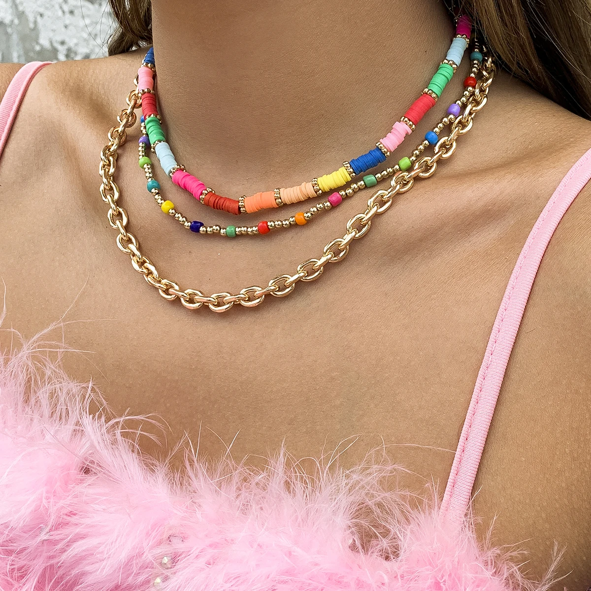 Lacteo Bohemian Rainbow Colorful Acrylic Chain Necklace For Women Trendy Heishi Clay Beads Multi Layered Choker Necklace Jewelry