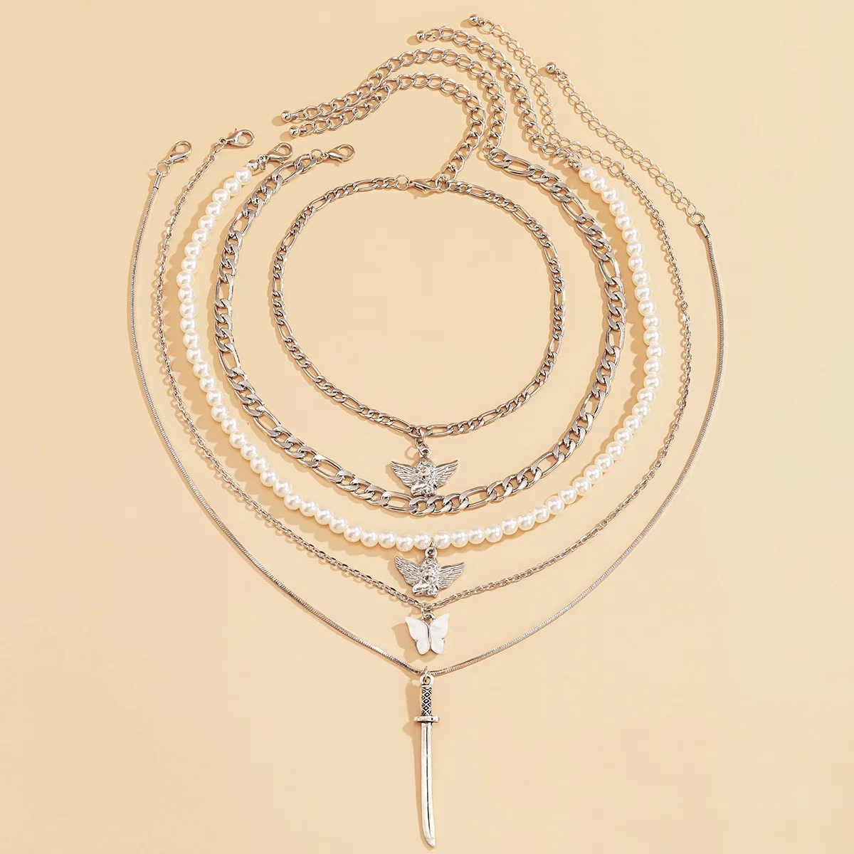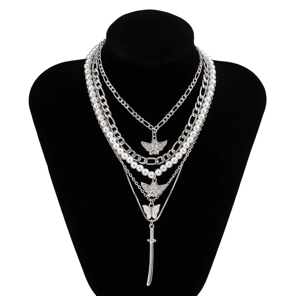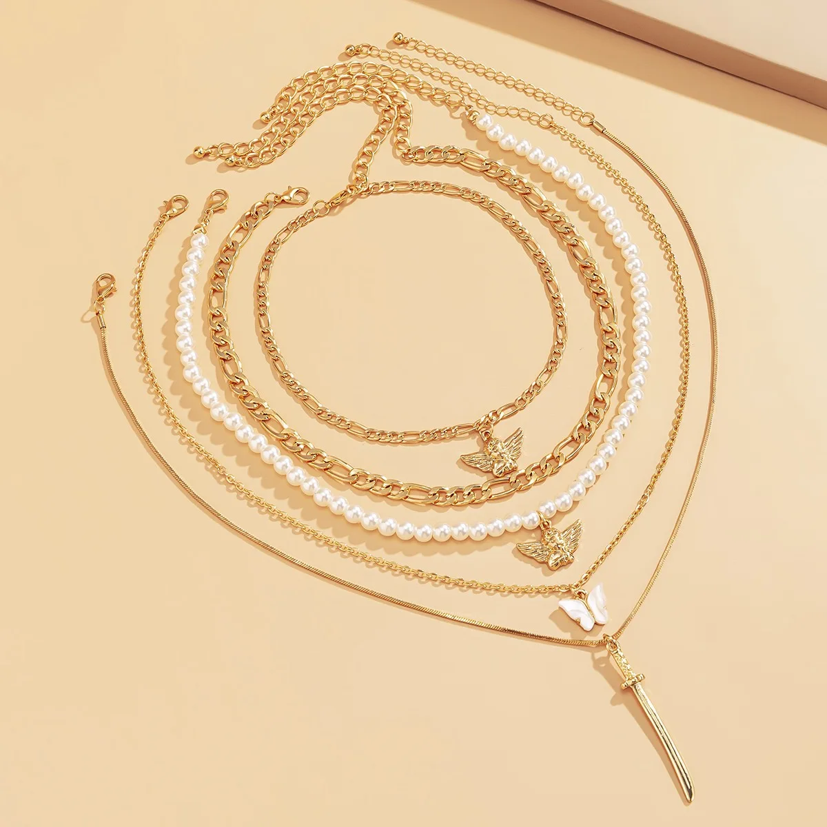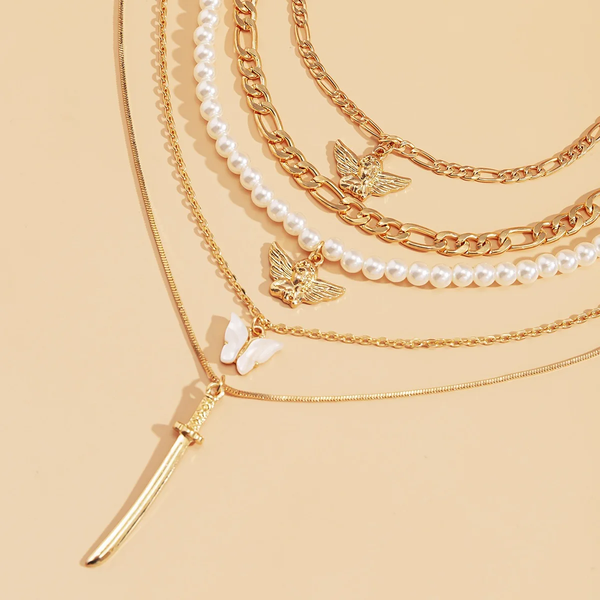 Ladies Multi-layer Chain Item Imitation Pearl Butterfly Pendant Necklace Multi-layer Gold Chain Party Jewelry 2021 New