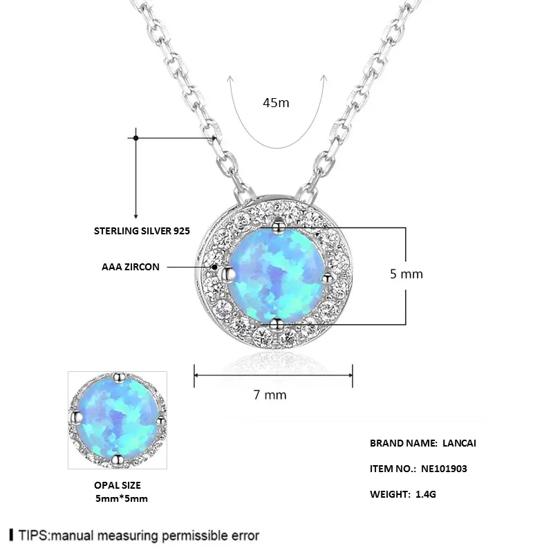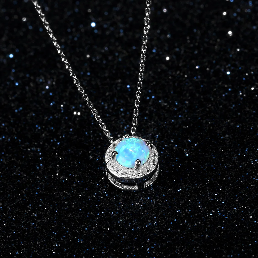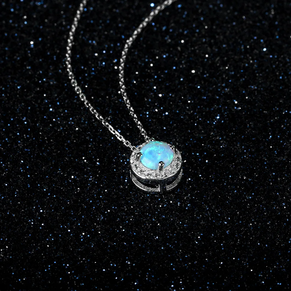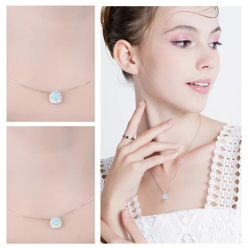 Fashion Round Simple Style Blue Fire Opal Fine Jewelry Inlaid White Zircon 925 Sterling Silver Pendant Necklace for Women