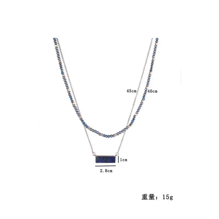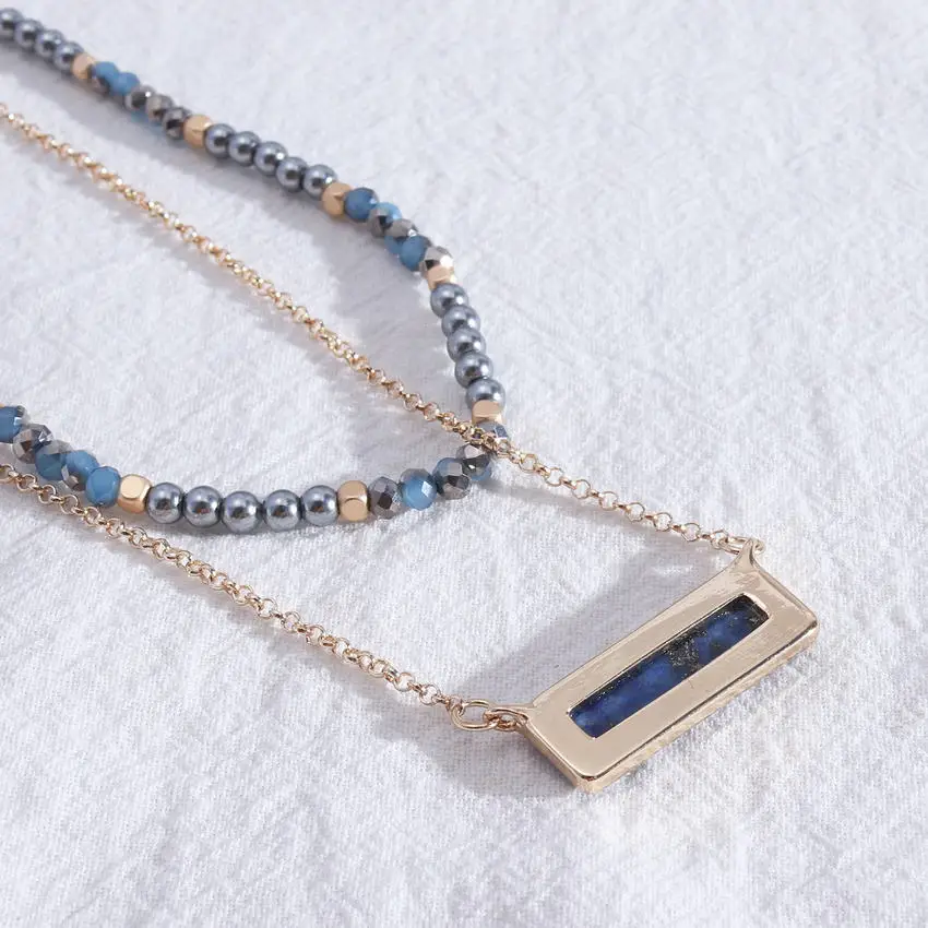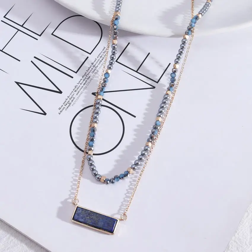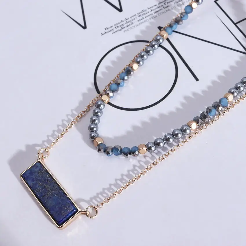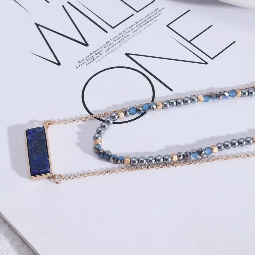 Layered Horizon Lapis Lazuli Stone Bar Pendant Necklace 2022 Gold Color Cube Beads Pearl Glass Beaded Chain Necklace