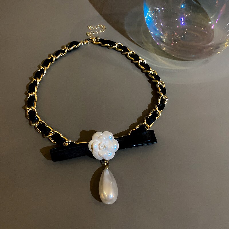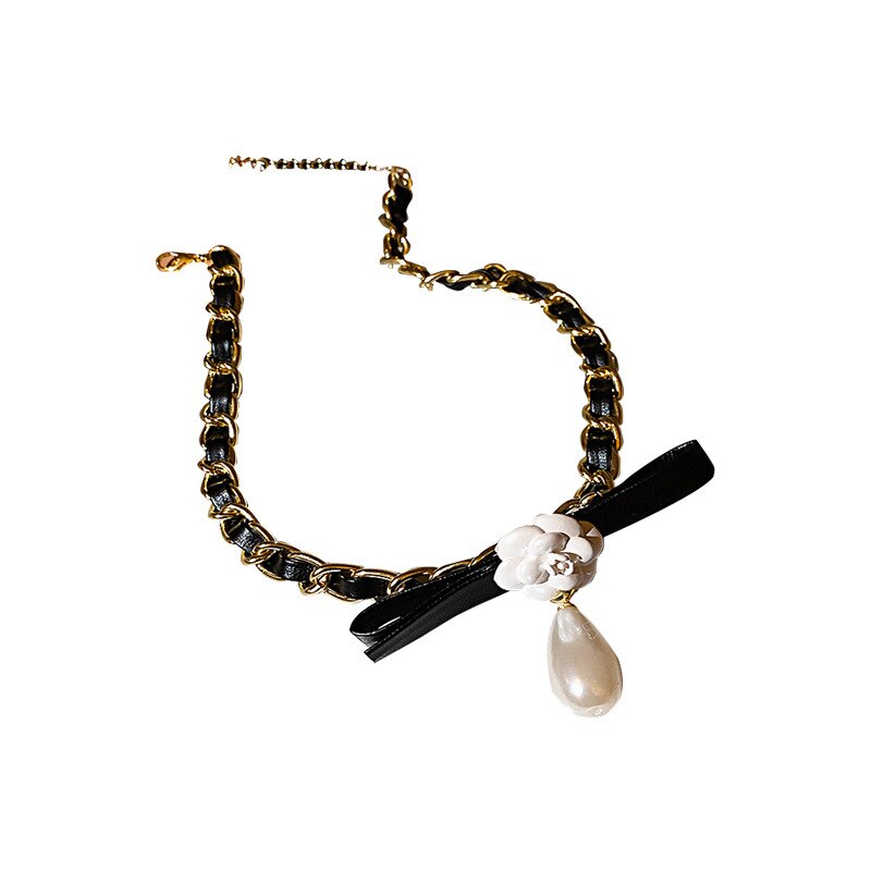 Leather chain pearl flower necklace metal personality temperament necklace retro personality tide necklace for women
