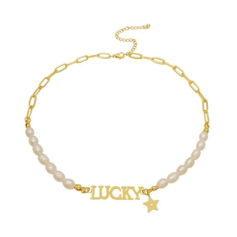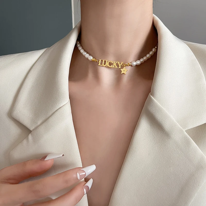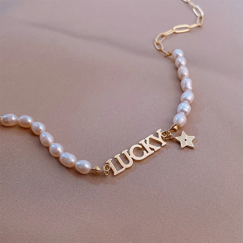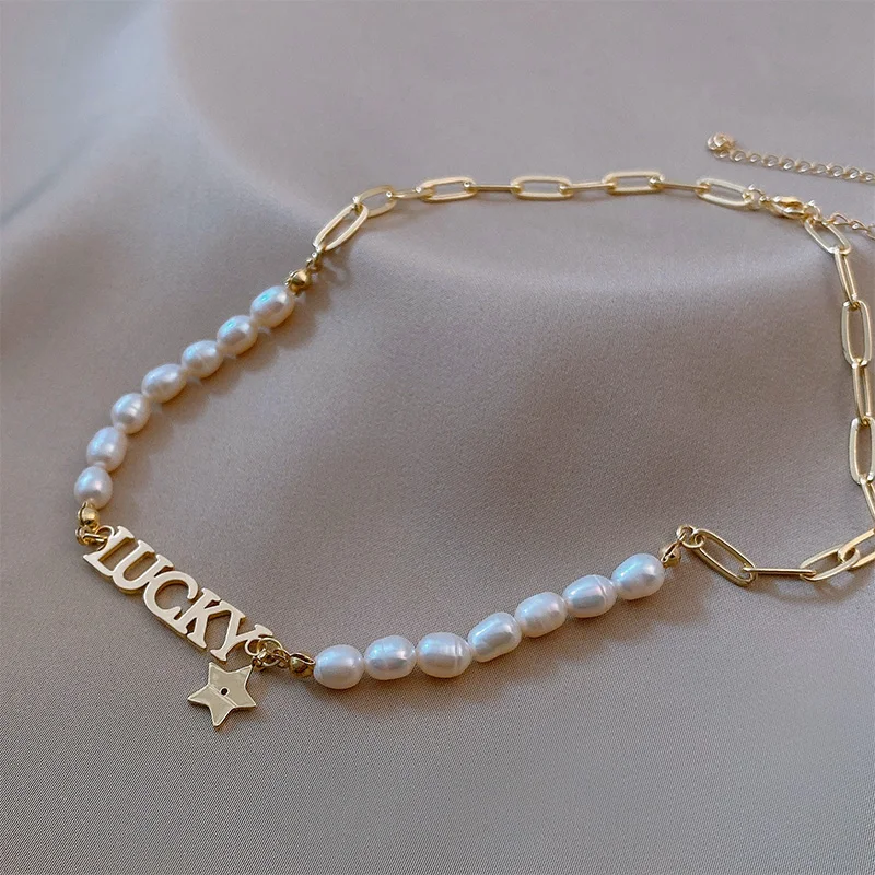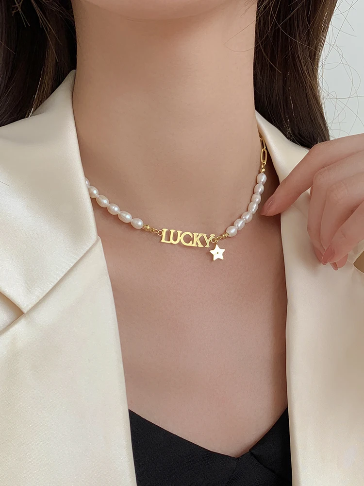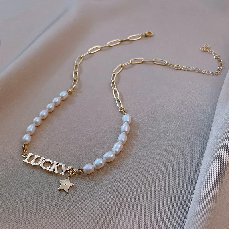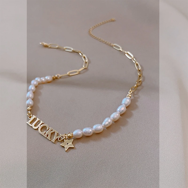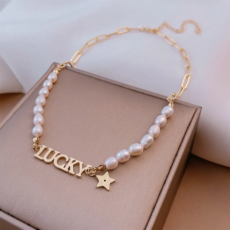 Letter Lucky Pendants Necklace Women Vintage French Romantic Style Freshwater Pearls Clavicle Chain Trend Splice Jewelry