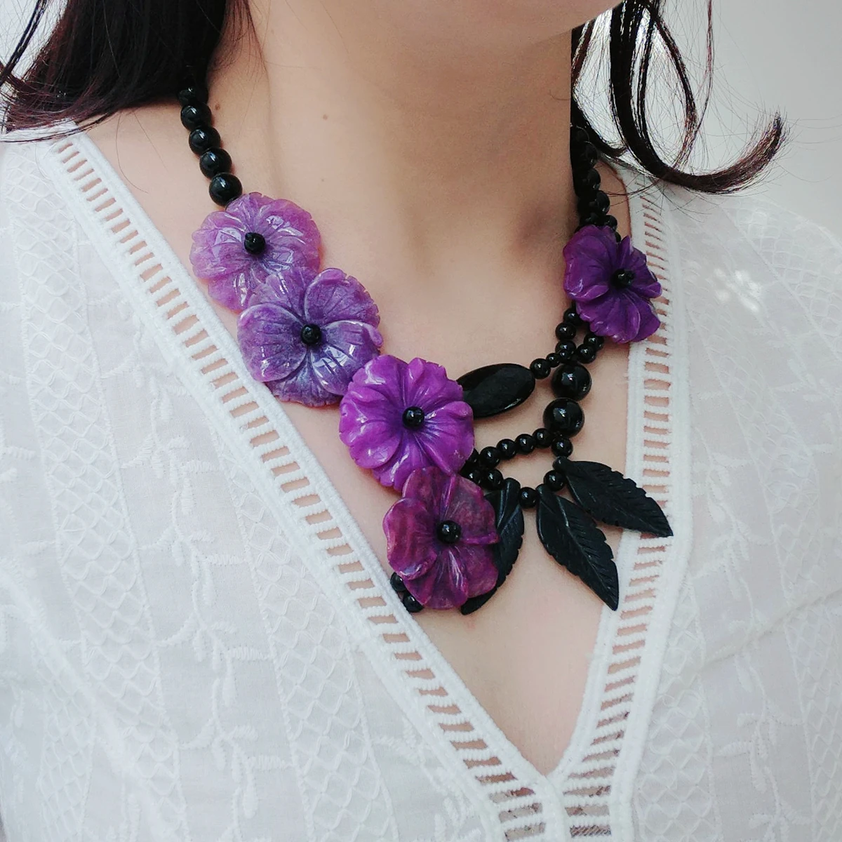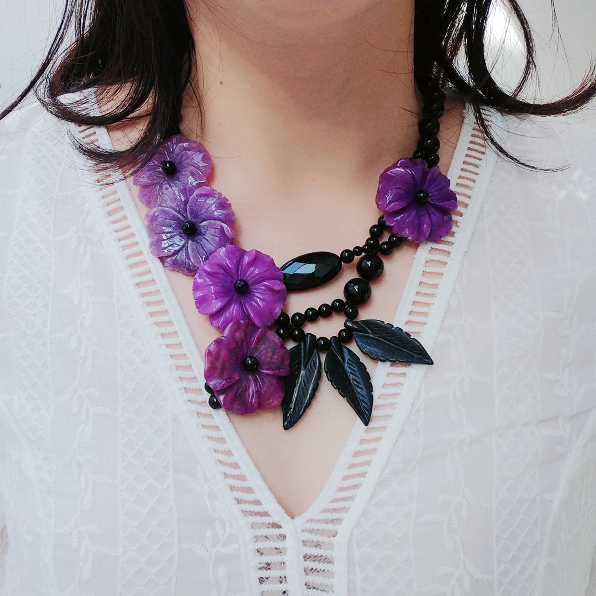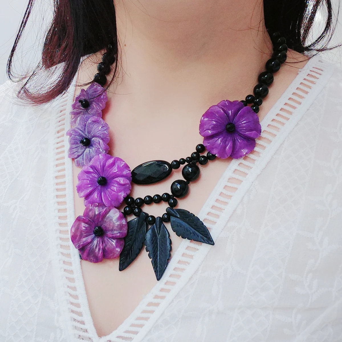 Lii Ji Real Stone Purole Jades Flowers Black Onyx Statement Necklace 50cm Women Jewelry Gift