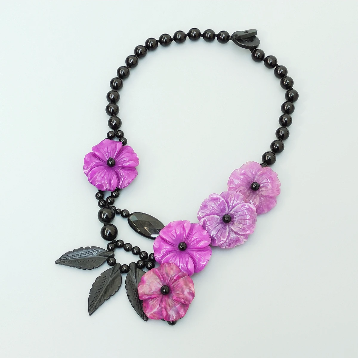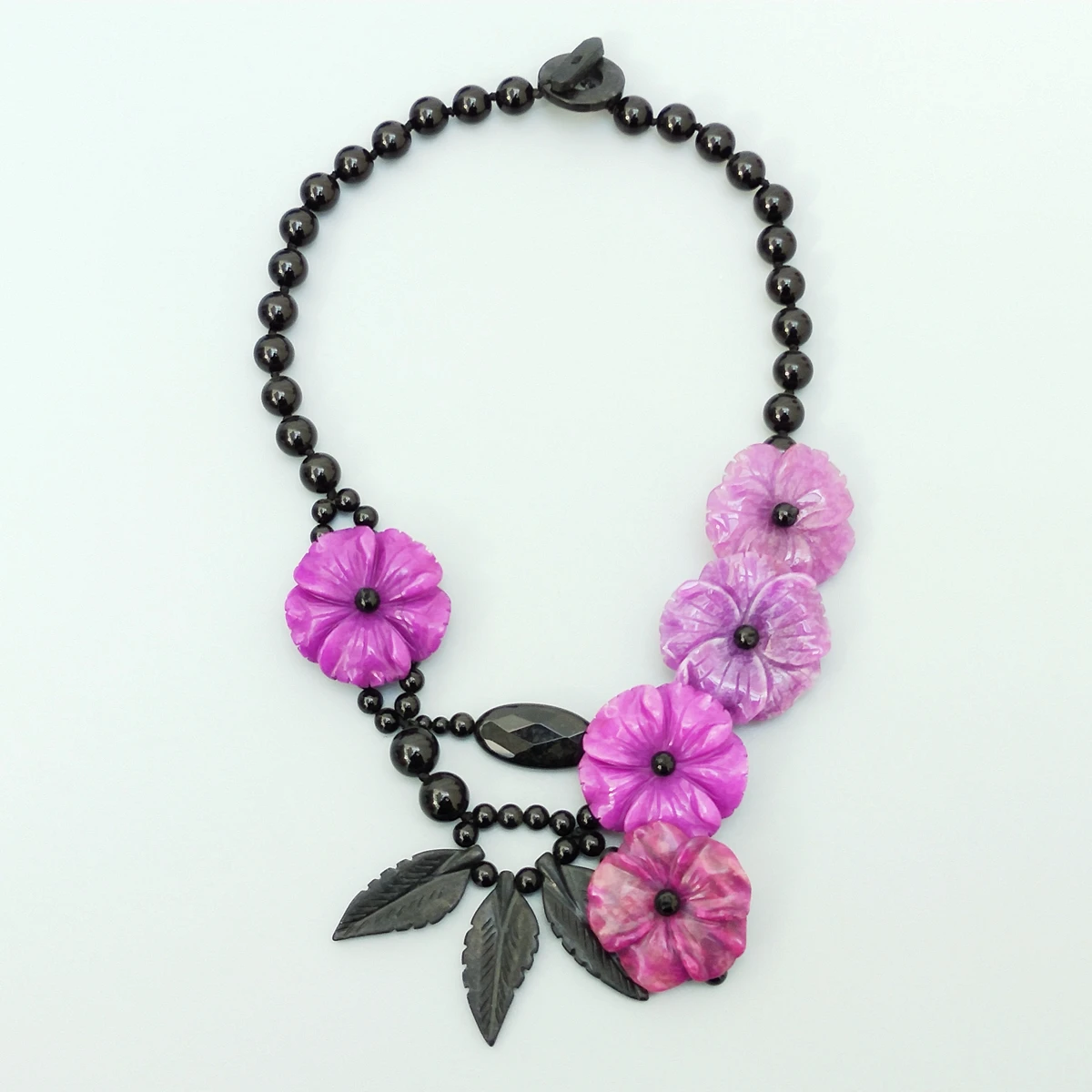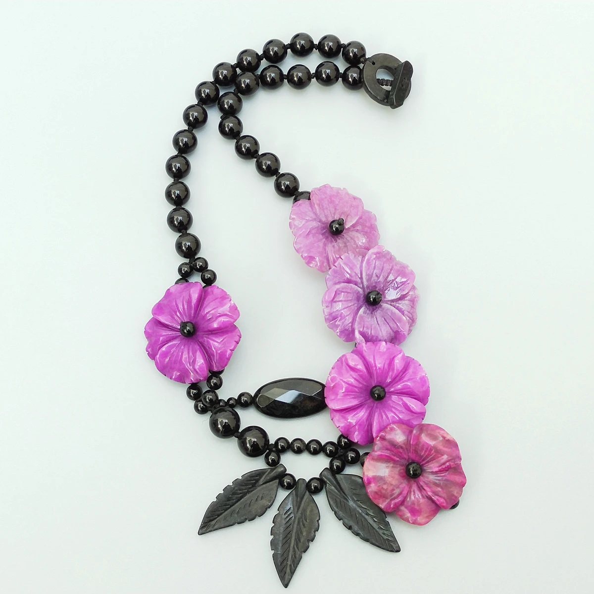 Lii Ji Real Stone Purole Jades Flowers Black Onyx Statement Necklace 50cm Women Jewelry Gift