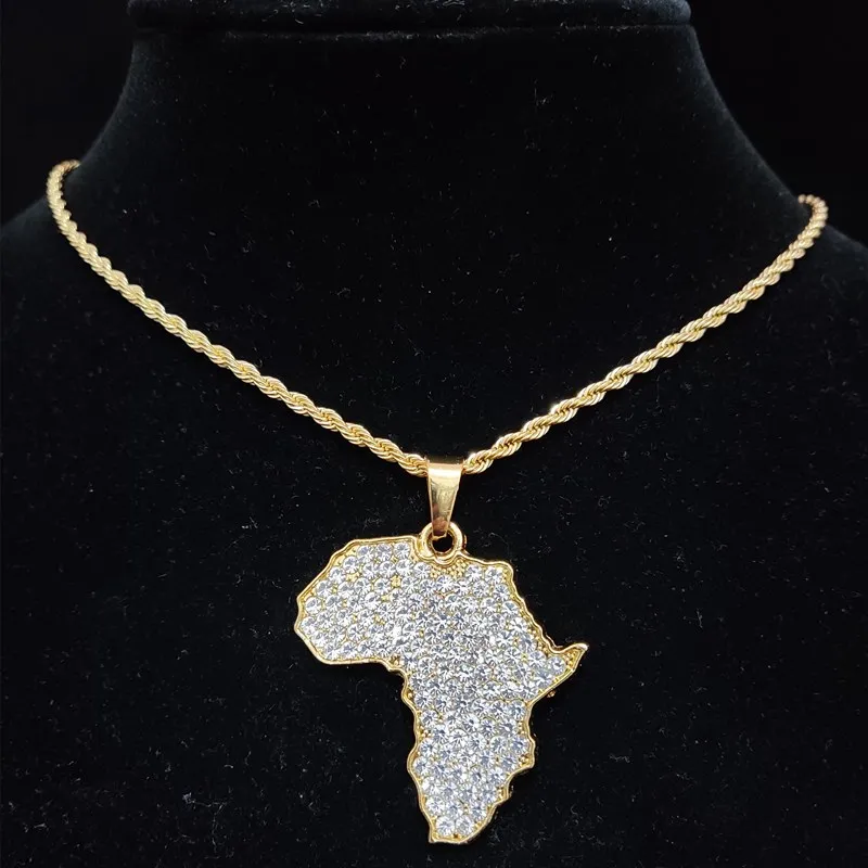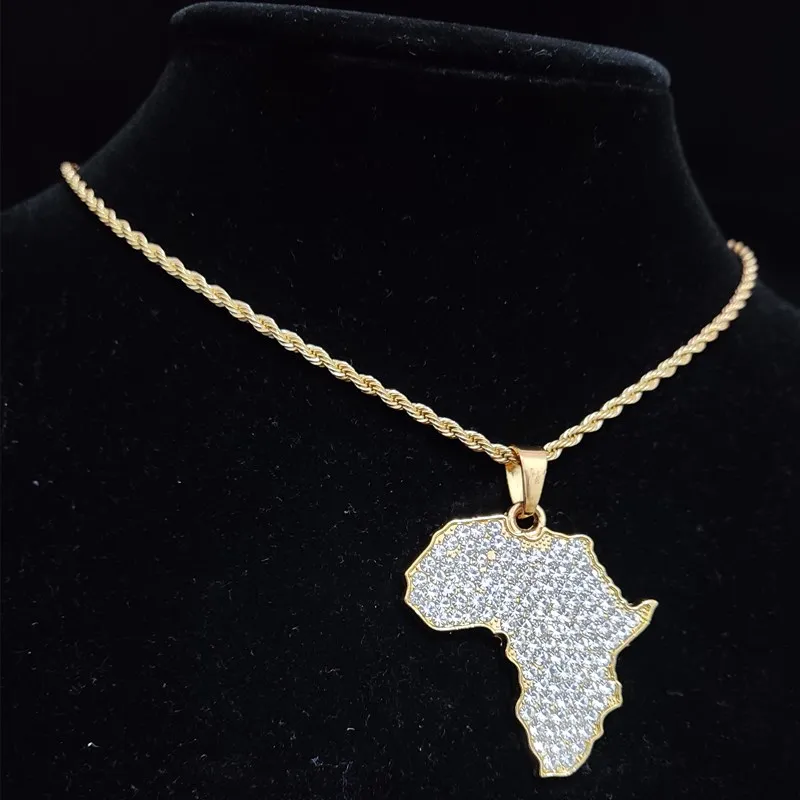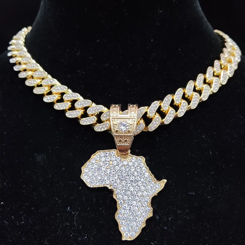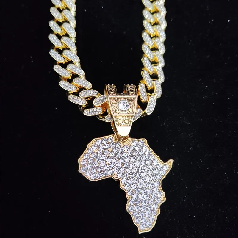 Men Women Hip Hop Iced Out Bling Map of Africa Pendant Necklace with 13mm Cuban Chain HipHop Necklaces Charm Jewelry