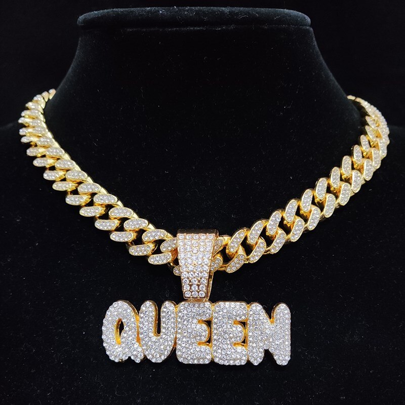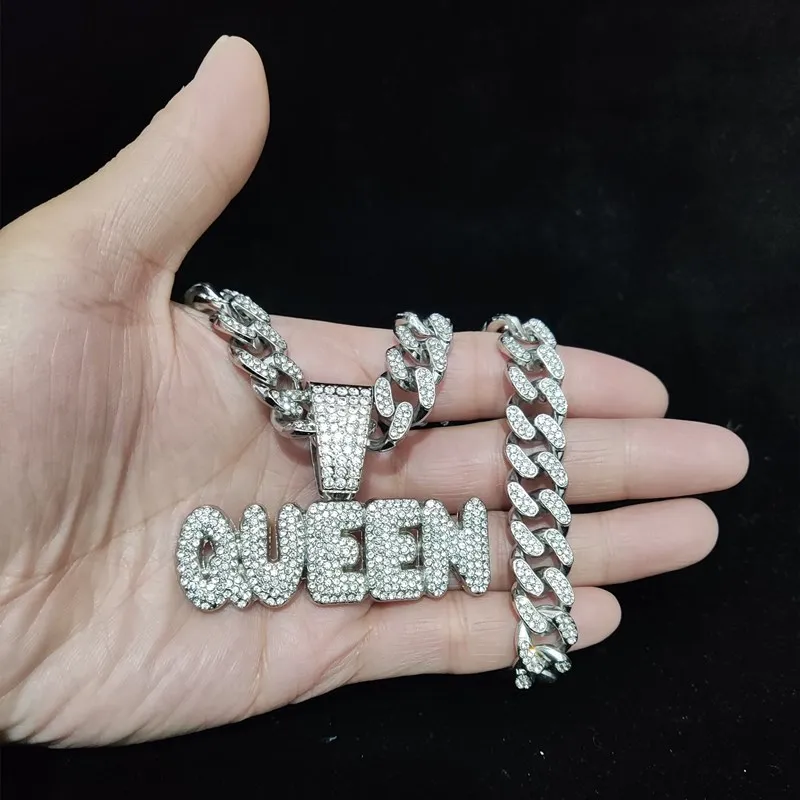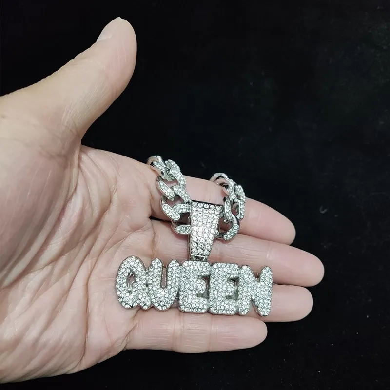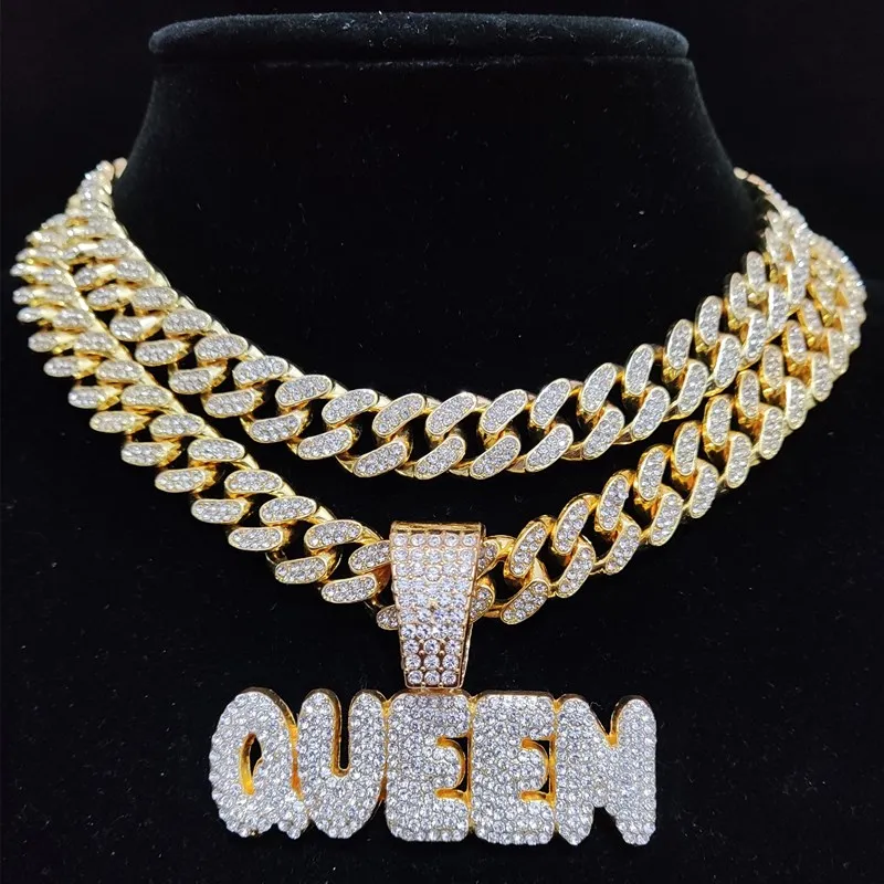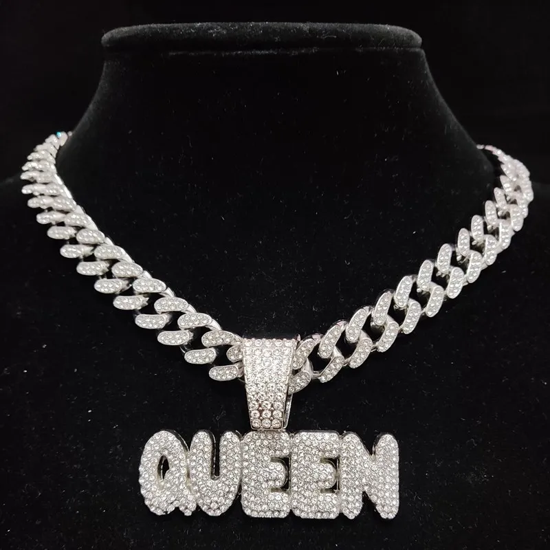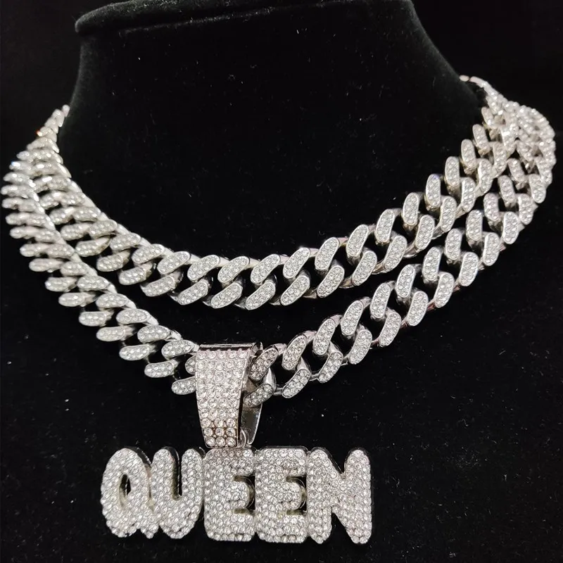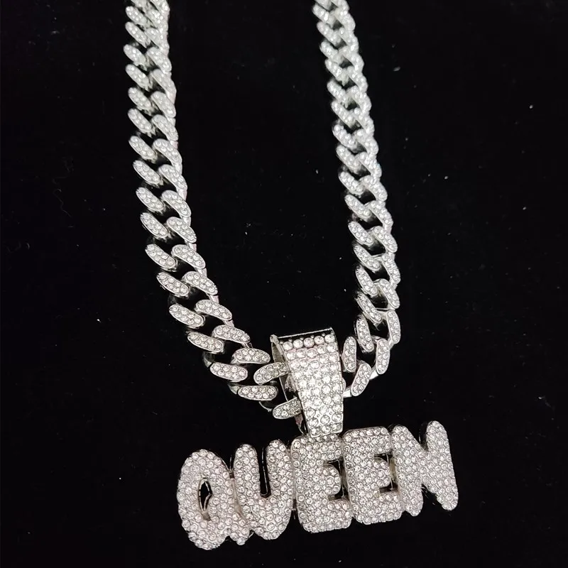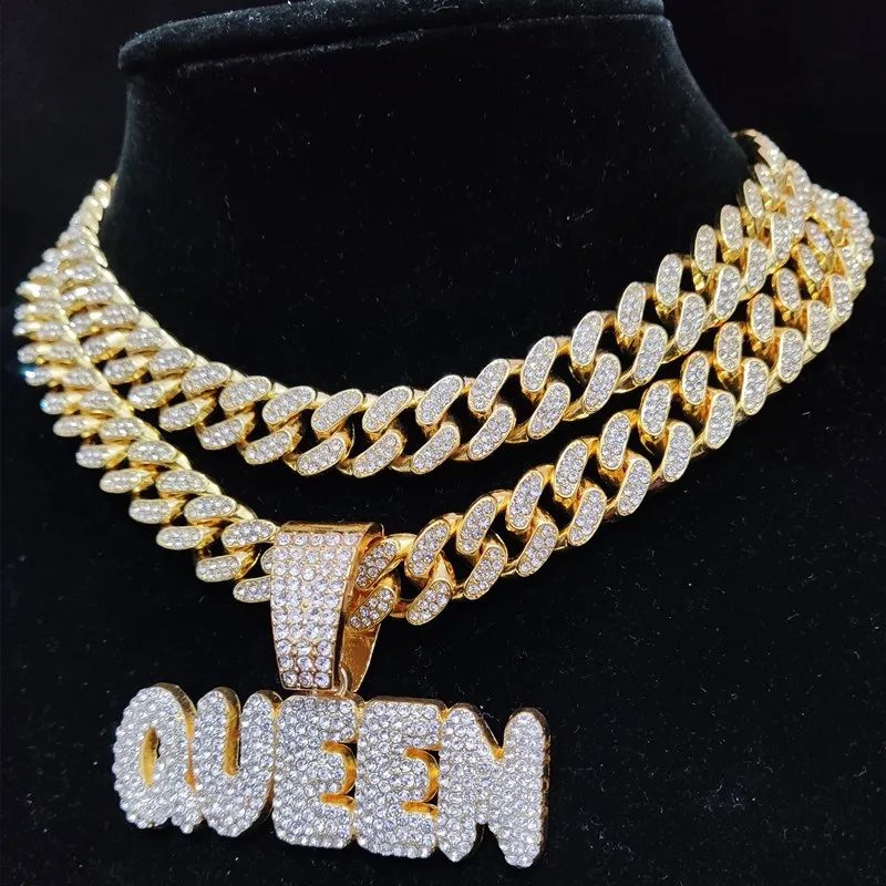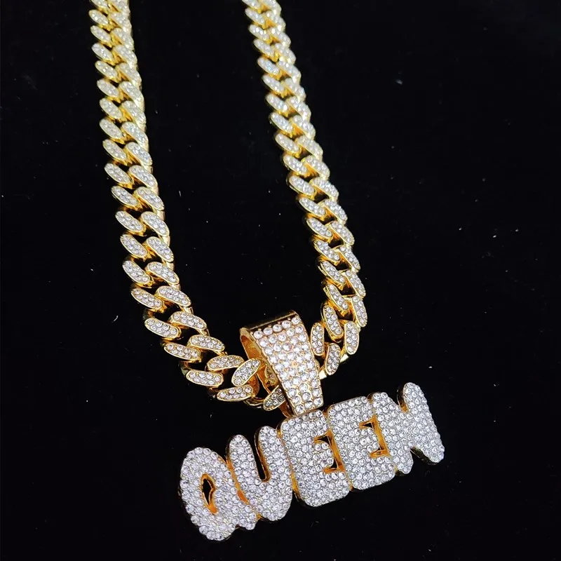 Men Women Hip Hop Queen Letter Pendant Necklace 13mm Crystal Cuban Chain HipHop Iced Out Bling Necklaces Charm Jewelry