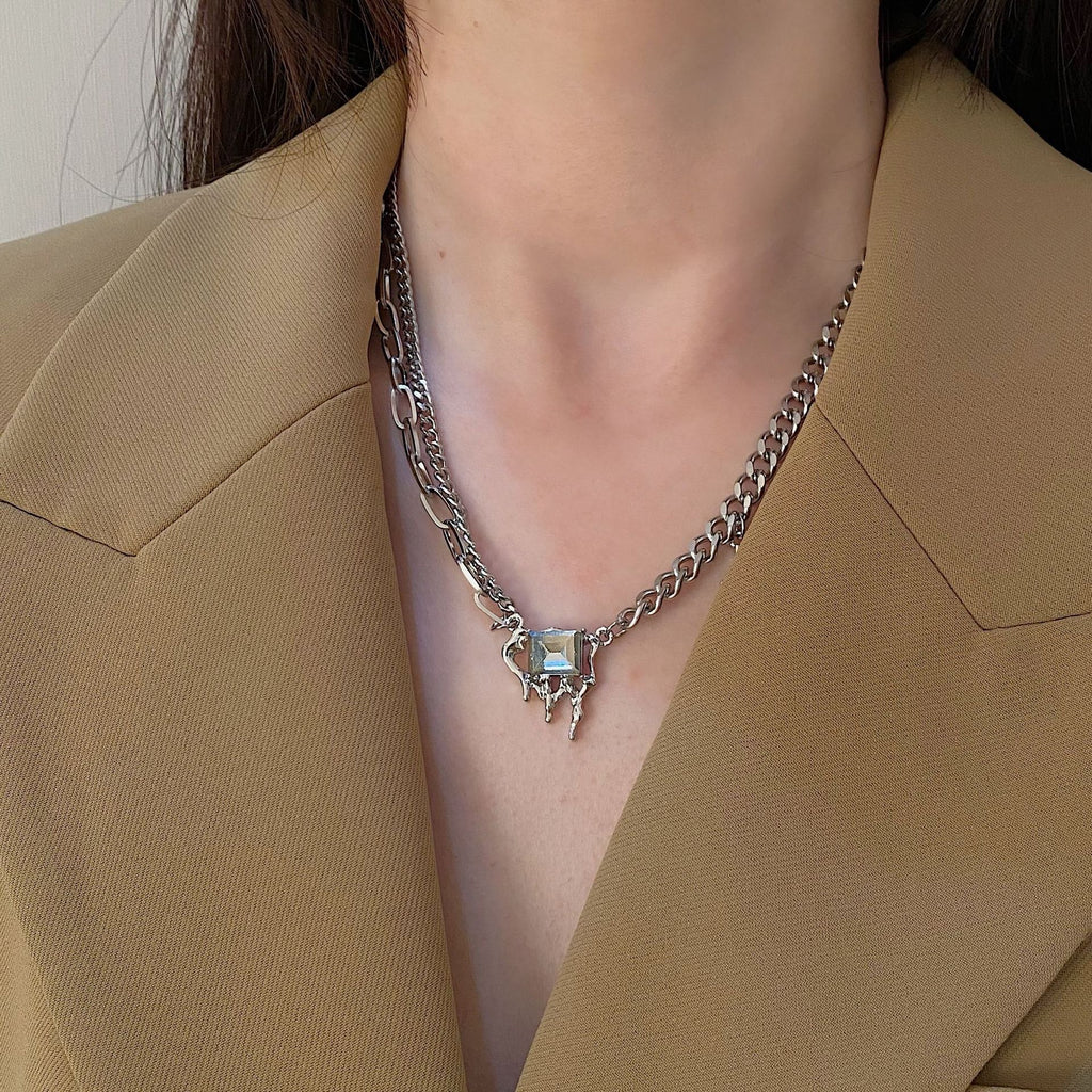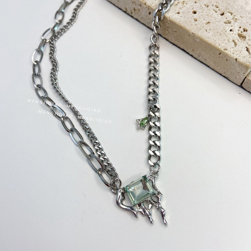 MENGJIQIAO Punk Irregular Metal Link Chain Necklaces For Women Girls Cute Green Square Crystal Pendant Party Jewelry