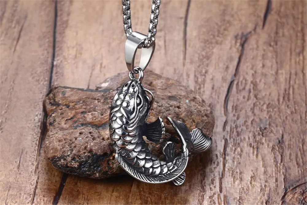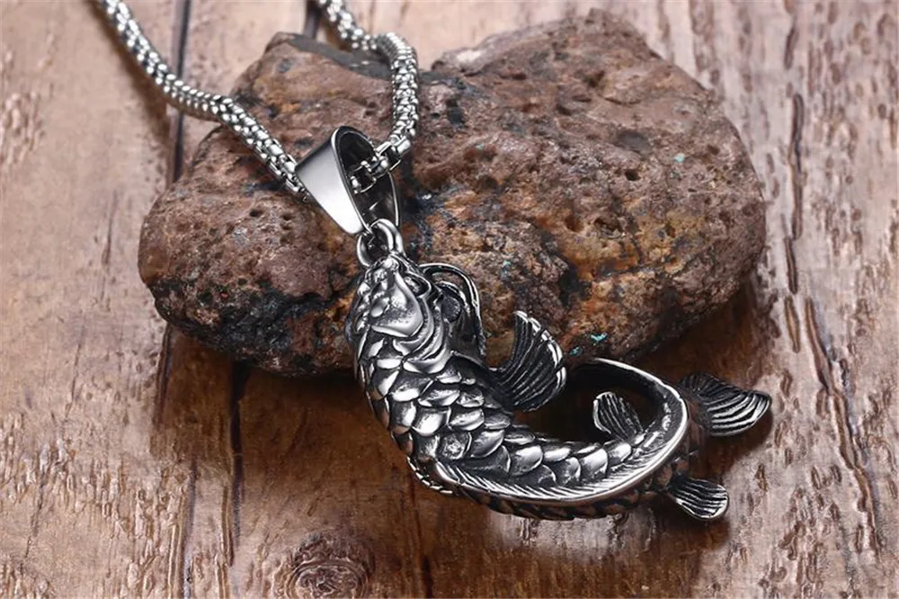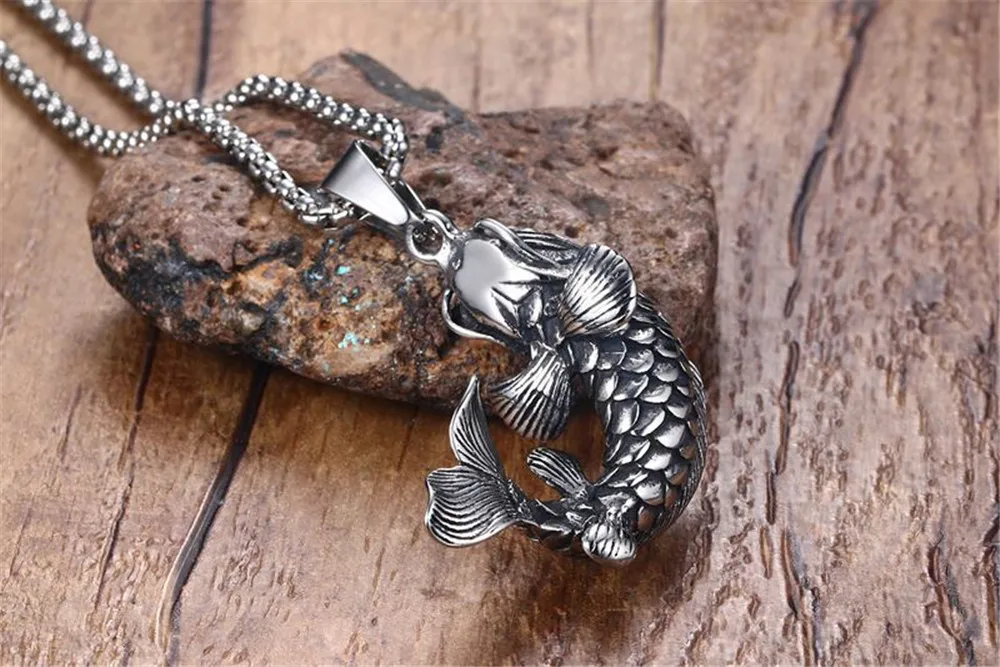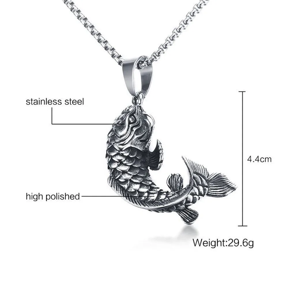 Mens Goldfish Hooked 3D Koi Fish Pendant Necklace in Stainless Steel Mythical Ocean Jewelry Collares Collier Colar