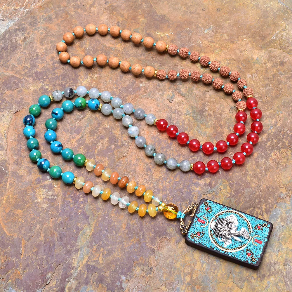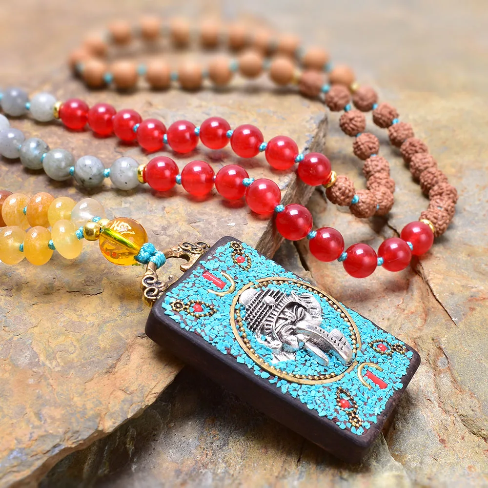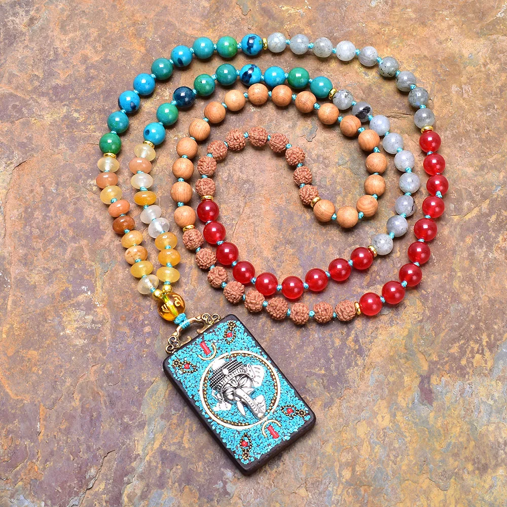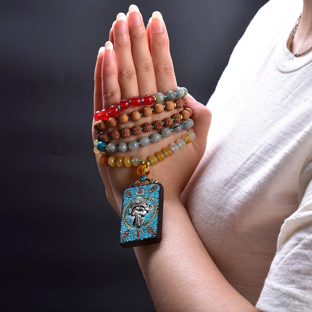 Mixed Natural Stone, Arborvitae Rudraksha Bead Knotted Long Necklace 108Japamala Ganesha Wood Pendant Necklace Buddhist Jewelry