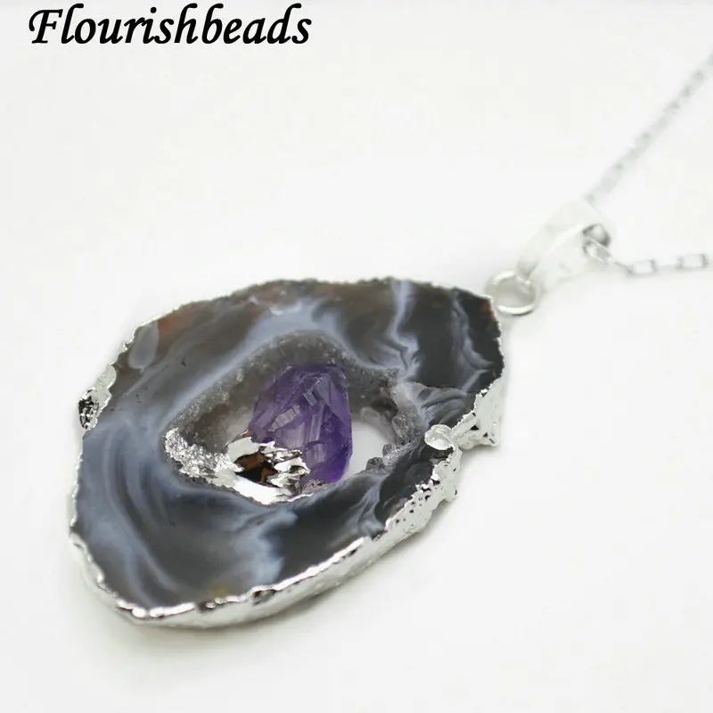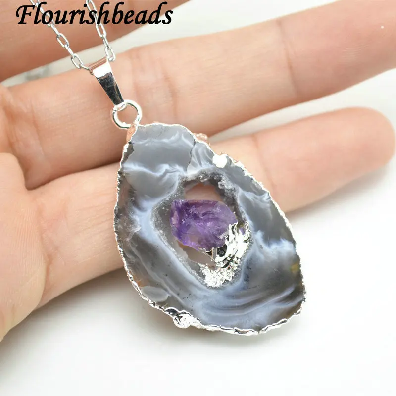 Natural Geode Agate Druzy Slice Pendant Amethyst Nugget Beads Inl Double Layer Pendant Necklace Jewelry