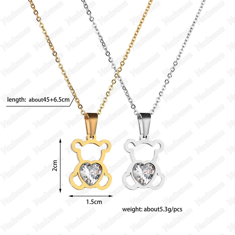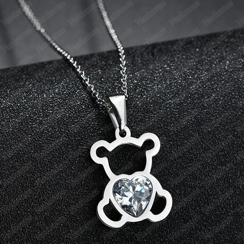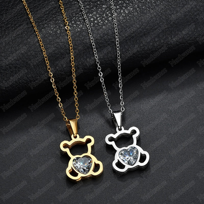 Nextvance Hollow Stainless Steel Bear Pendant Necklace Cute CZ Stone Love Heart Animal Necklace Girls Statement Jewelry