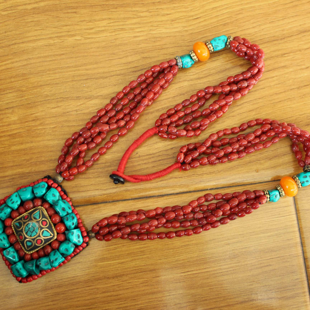 NK218 Ethnic Tibetan Long Flower Pendant Necklace Handmade Turquoises Beaded Necklace Bohemia Nepal Jewelry