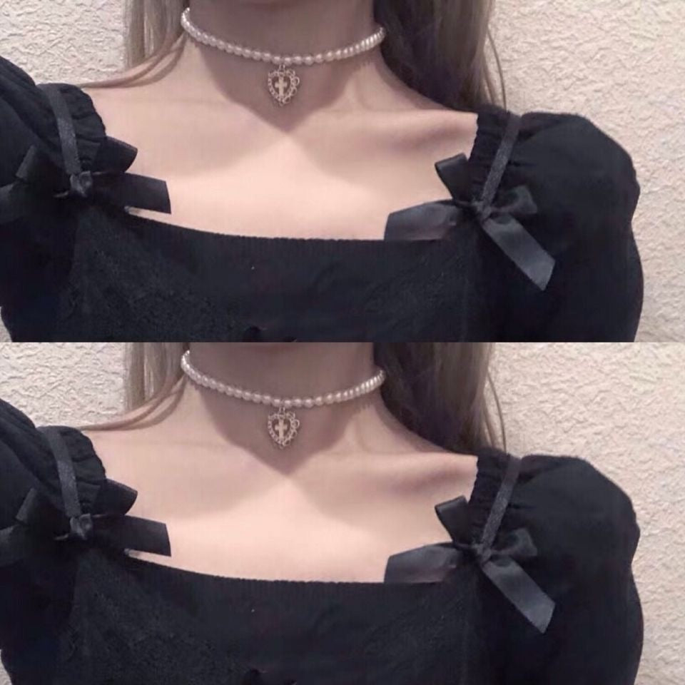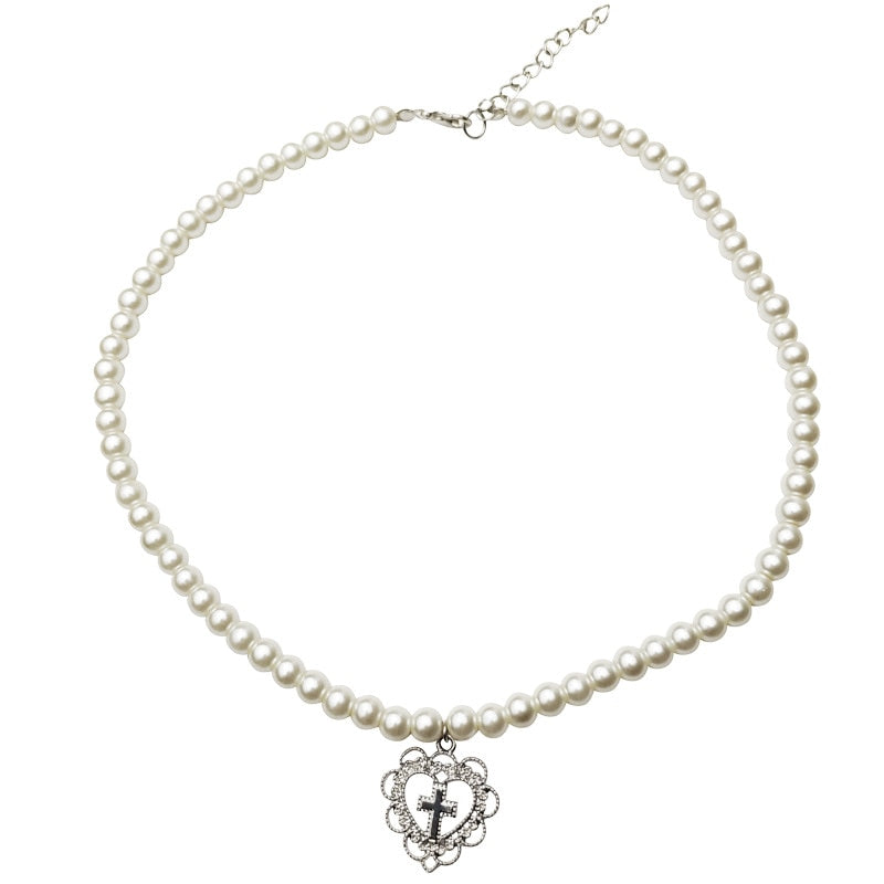 Punk Gothic Harajuku Pearl Chain Hollow Heart Shaped Pendant Retro Court Cross Choker Necklace Jewelry for Women Girls