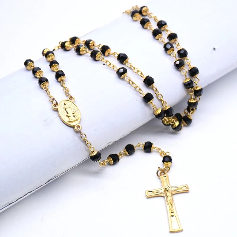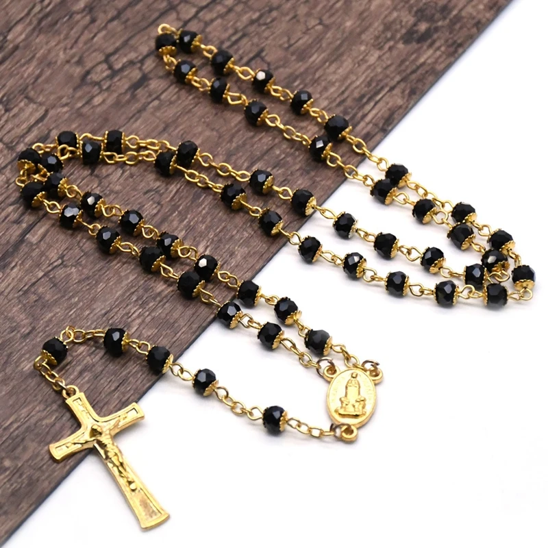 QIGO Black Crystal Rosary Necklace With Cup Gold Fatima Virgin Cross Necklace Catholic Religious Jewelry