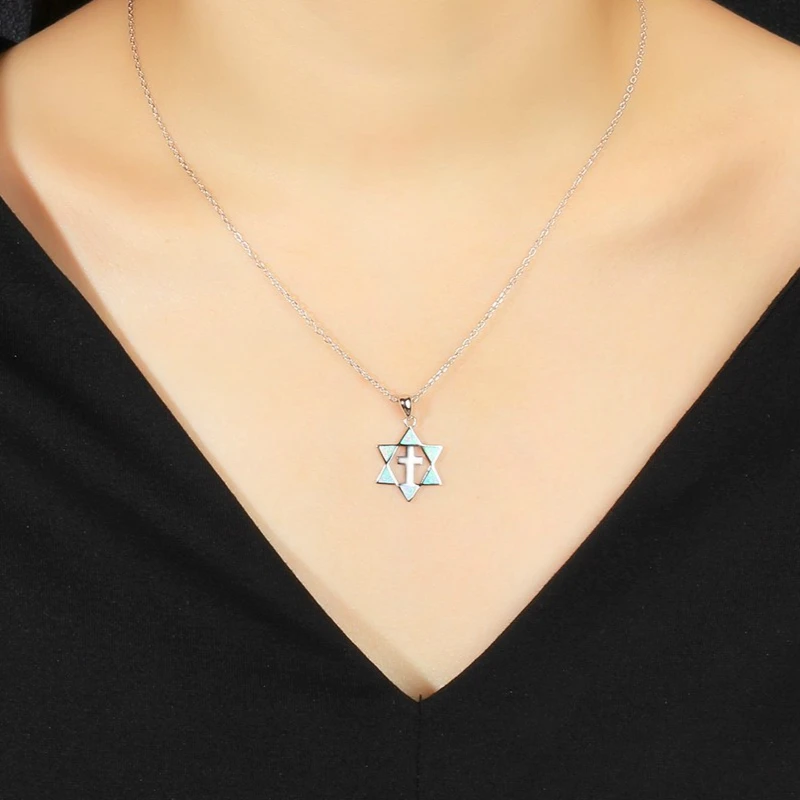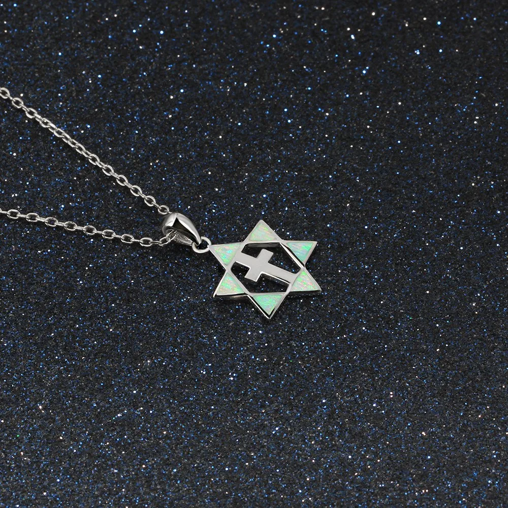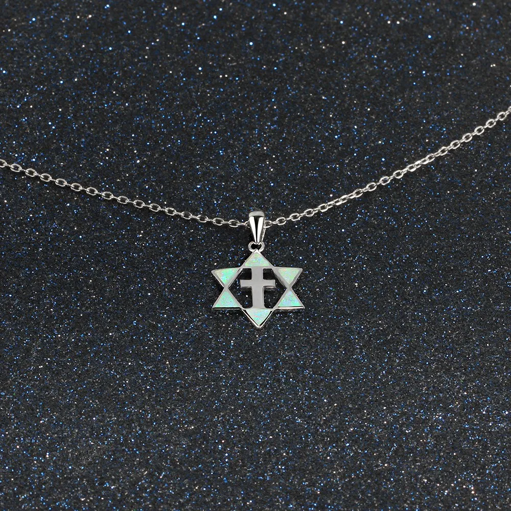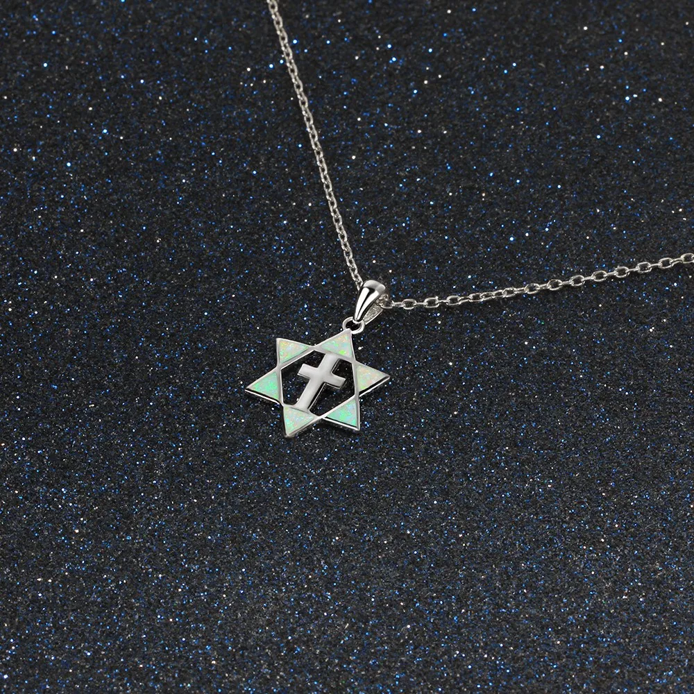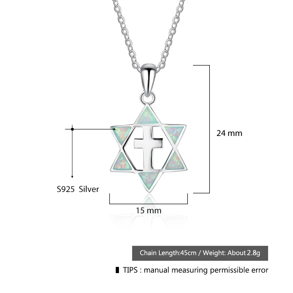 Real Pure 925 Sterling Silver Hexagram & Cross Pendant Necklace White Fire Opal Stone Fine Jewelry Accessories (Lam Hub Fong)