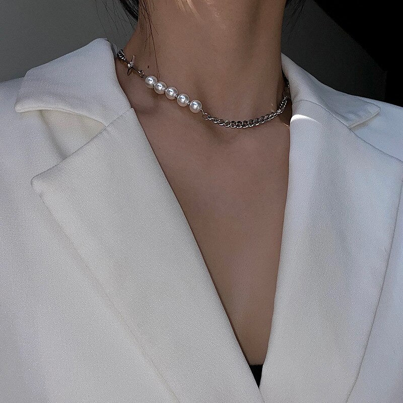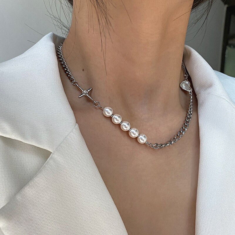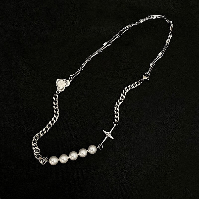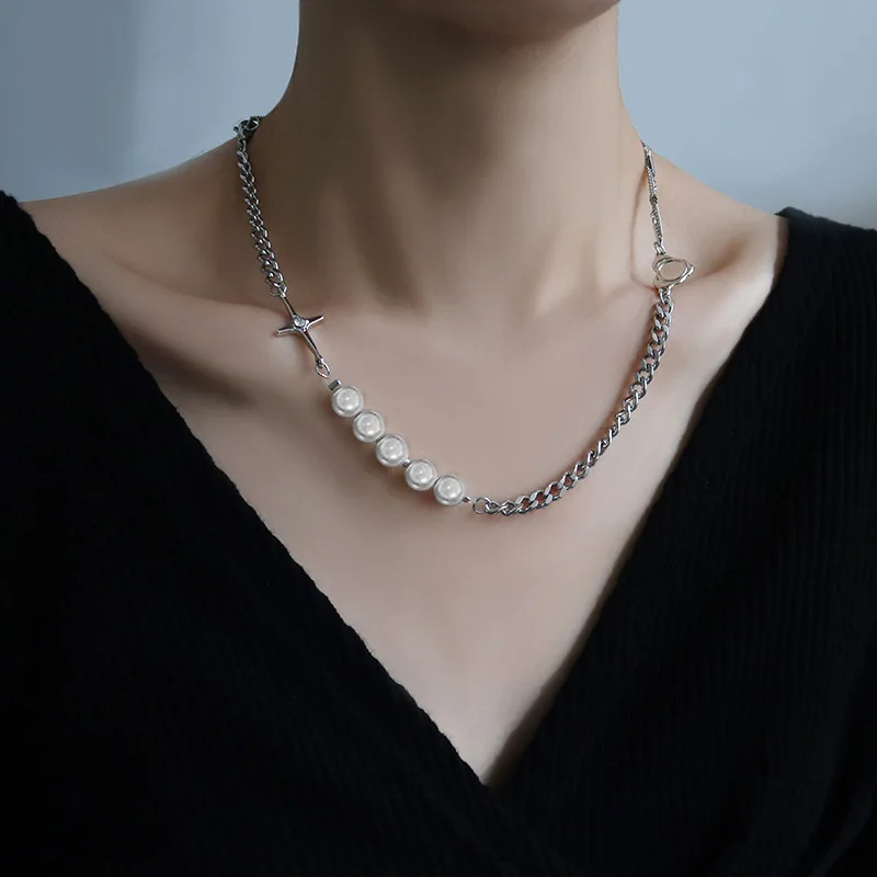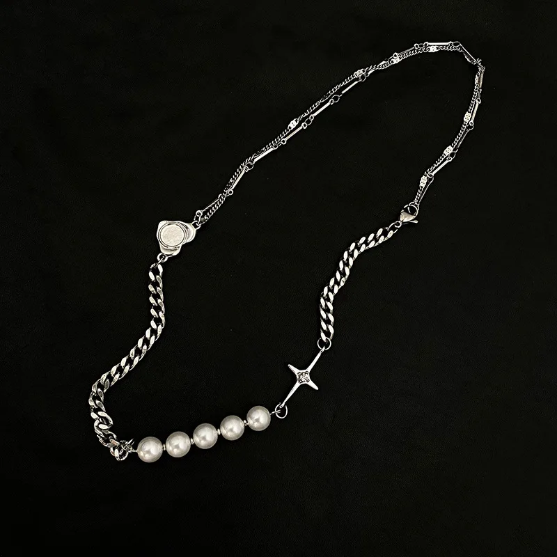 Reflective Pearl Stitching Necklace Women Hip Hop Accessories Necklace Woman Daily Casual Cross Clavicle Chain Ladies