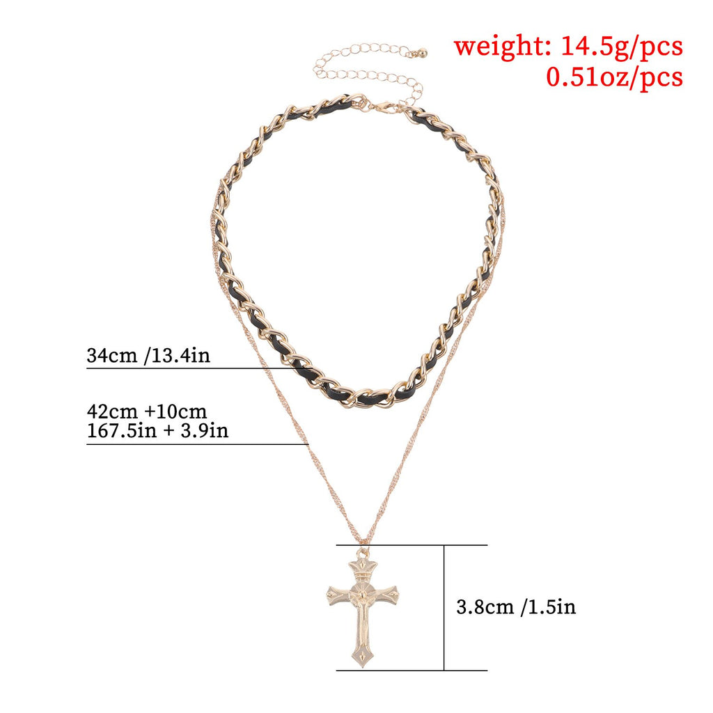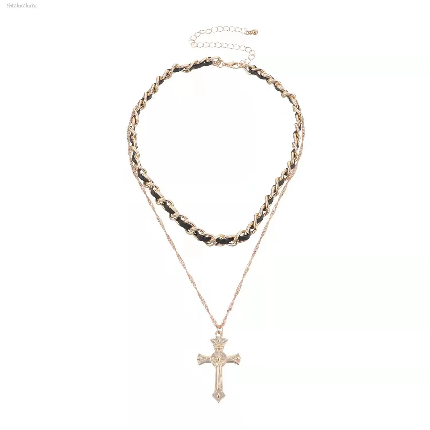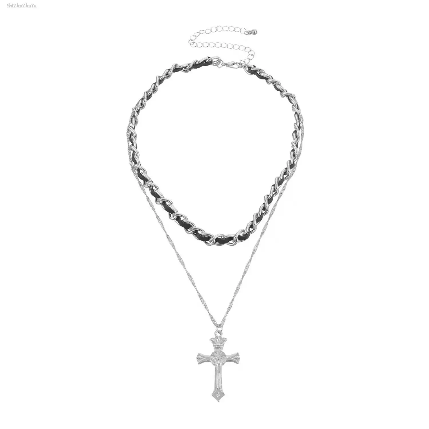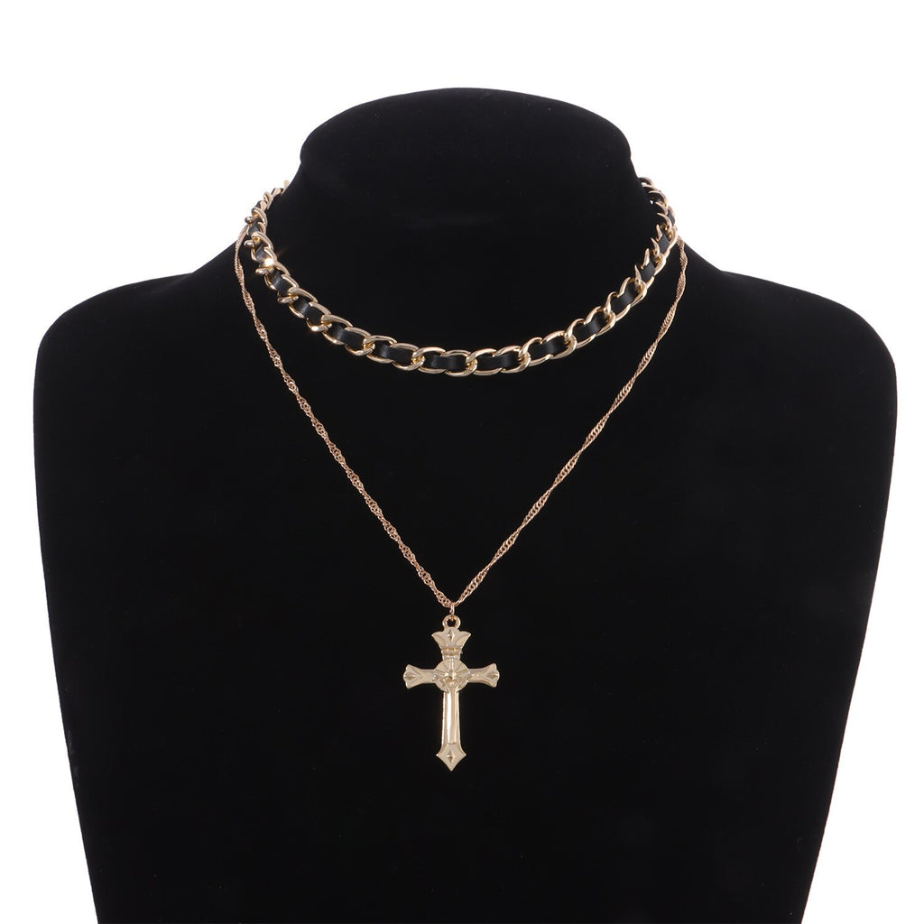 Retro Cross Multilayer Pendant Necklace Trend Punk Gothic Black Belt Neckband Metal Thick Chain Ladies Accessories