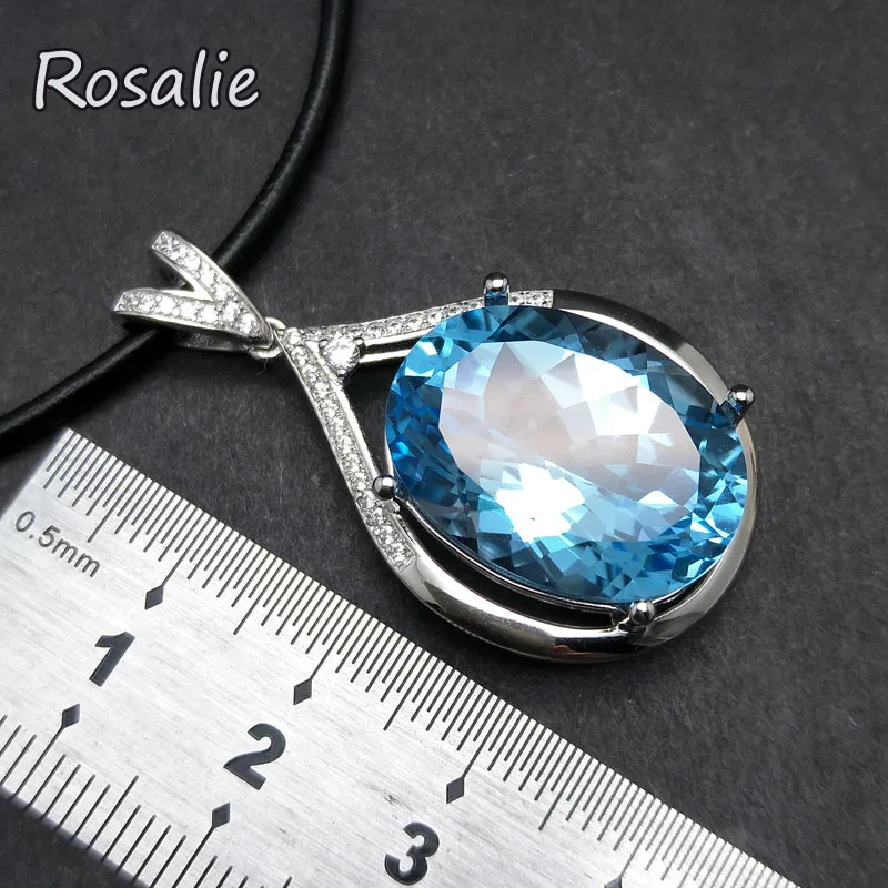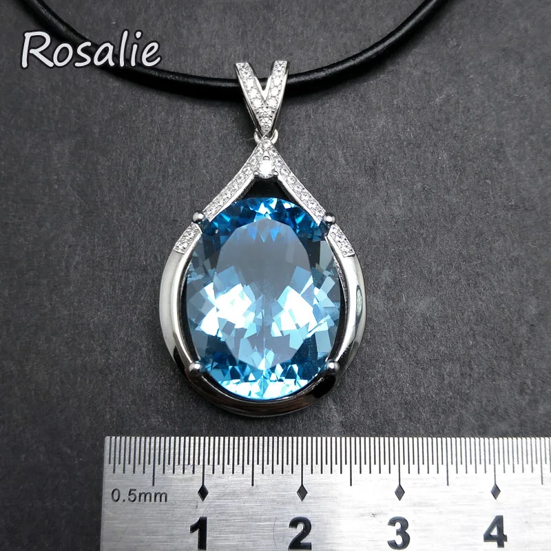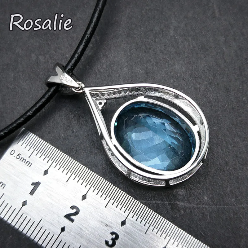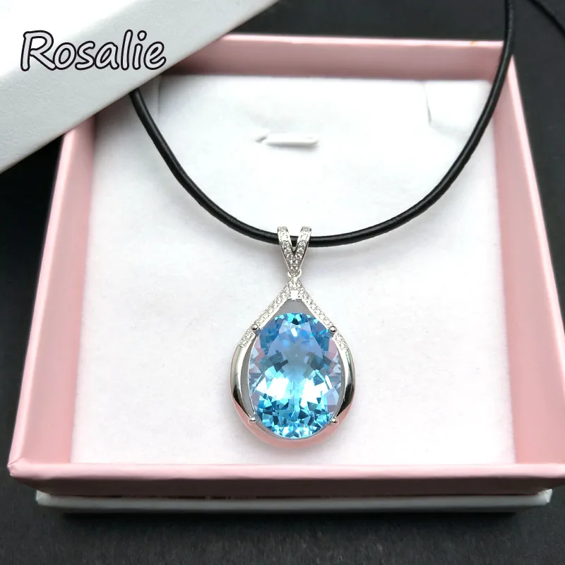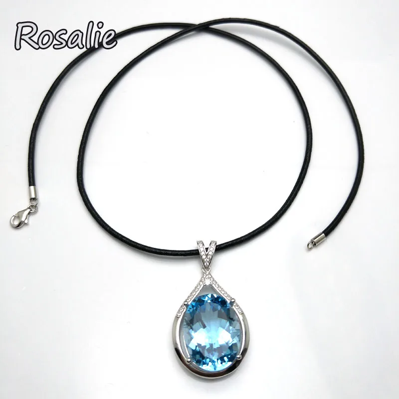 Rosalie,Shinning 21ct Natural stone Sky Blue Topaz Pendant leather chord necklace 925 Silver fine Jewelry for women best gift