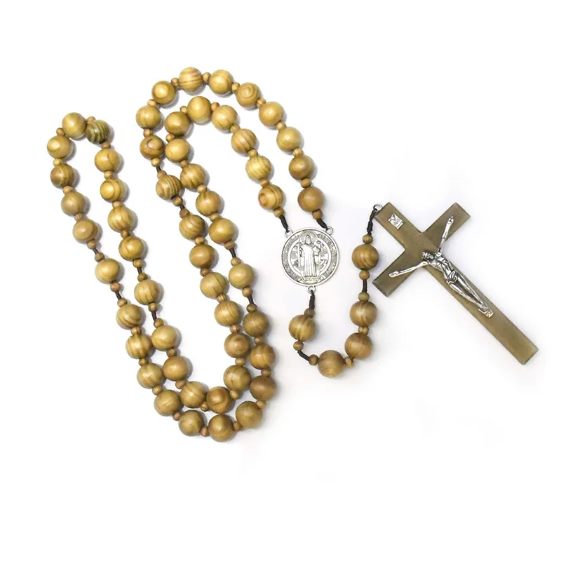 Saint Benedict CSPB Medal Wooden Bead Chain Rosary Necklace Catholic NRI Large Cross Pendant Necklaces Religious Wall Decor Gift