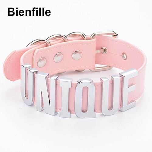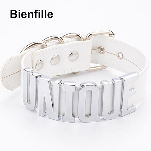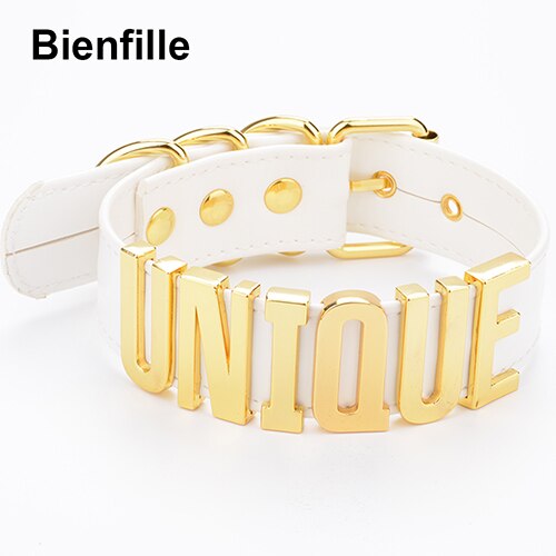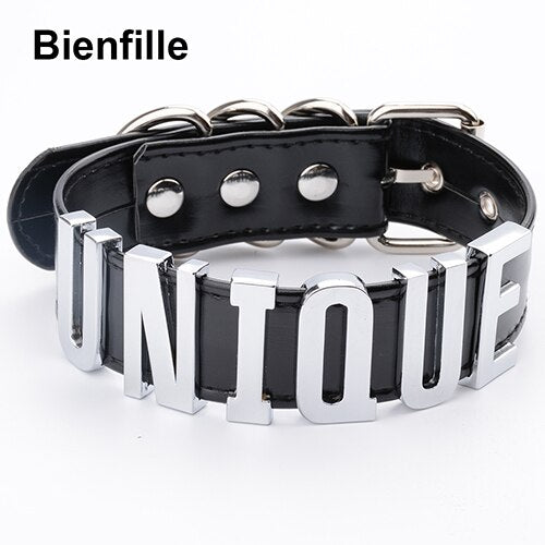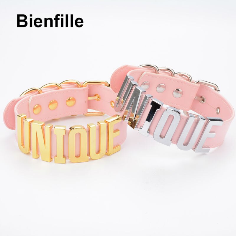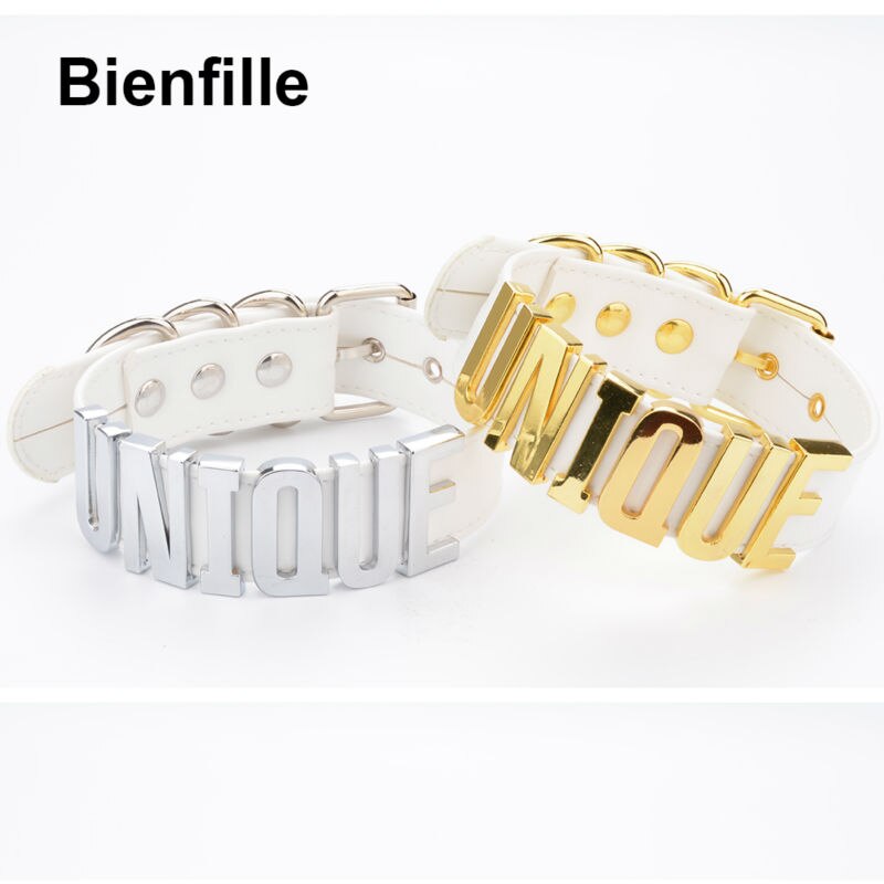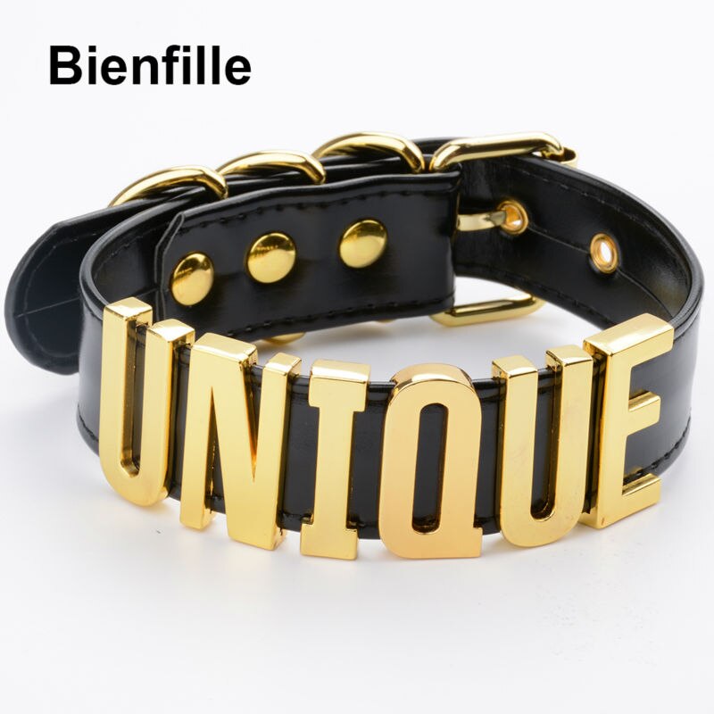Sexy Unique Choker Gold Metal Collar Handmade BDSM 35MM Big Words PU Leather Buckle Collar Fetish Necklace Women
