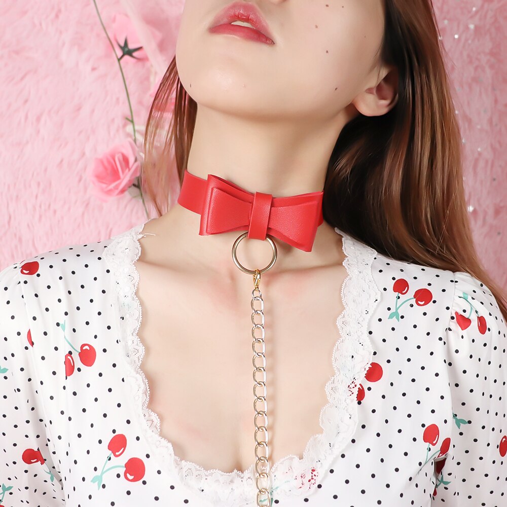 Sexy Women Red PU Leather Metal Chain Slave Traction Rope Punk Collar Choker Necklace Handmade Jewelry Accessories