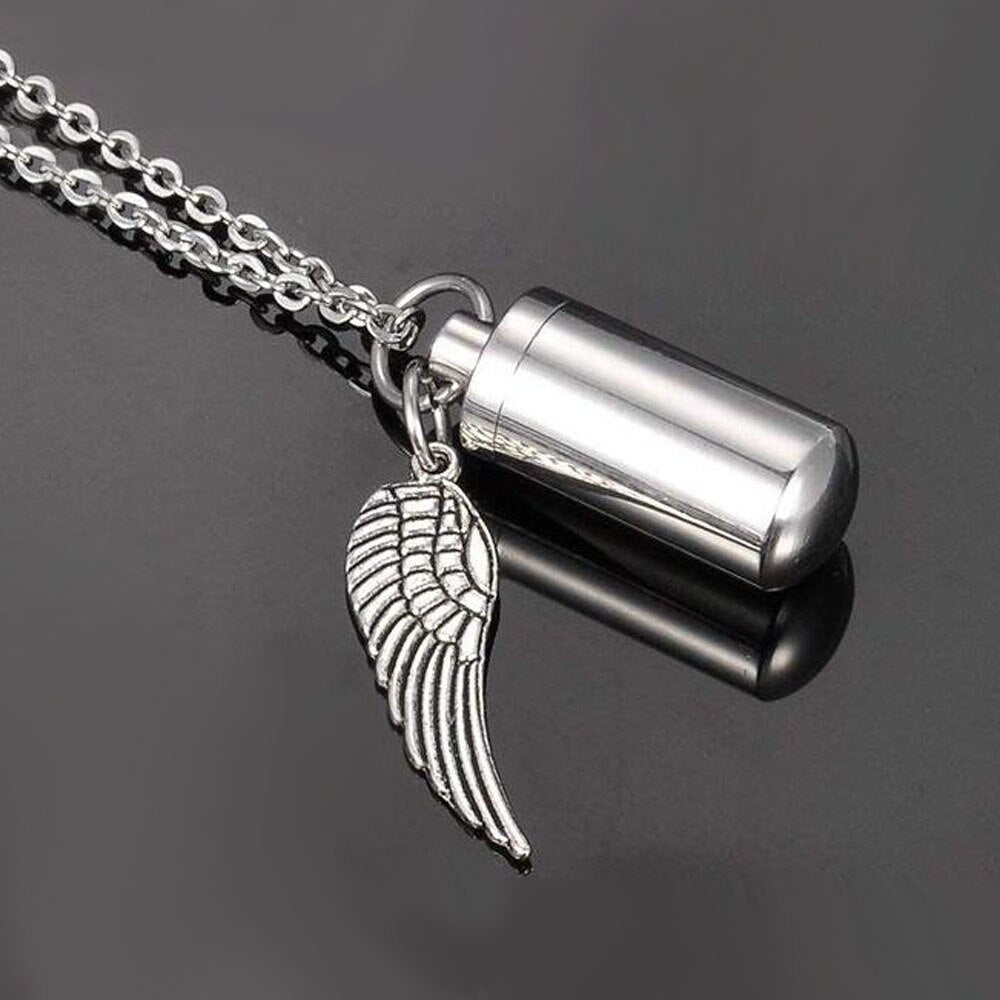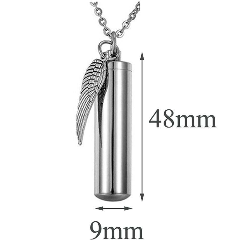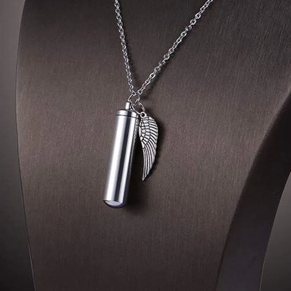 Stainless Steel Perfume Holder Cylinder Ashes Urn Pendant With Angel Wing Charm Cremation Memorial Necklace Jewelry