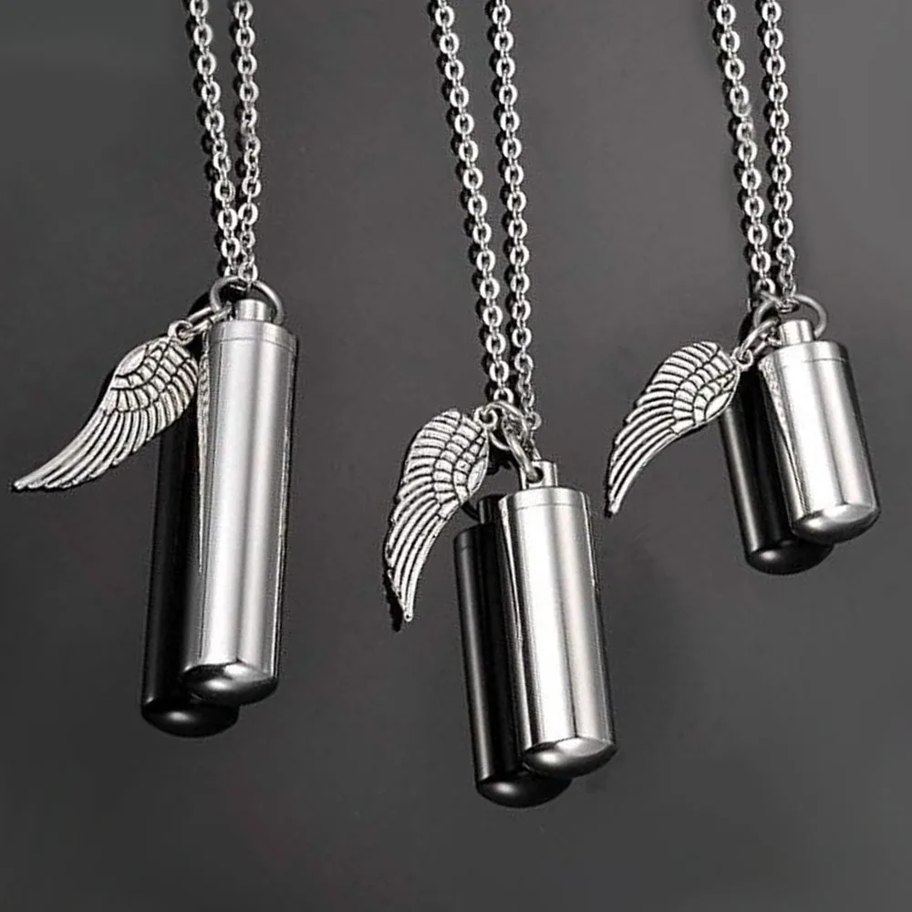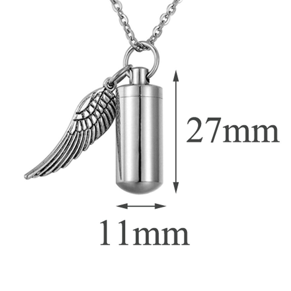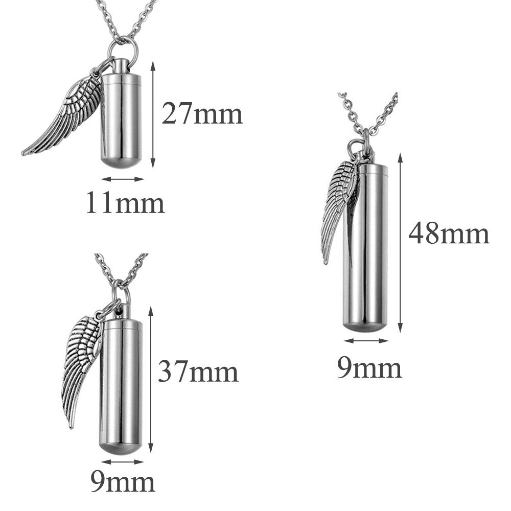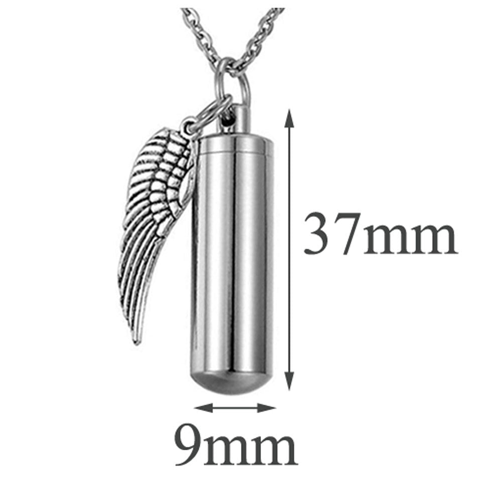 Stainless Steel Perfume Holder Cylinder Ashes Urn Pendant With Angel Wing Charm Cremation Memorial Necklace Jewelry