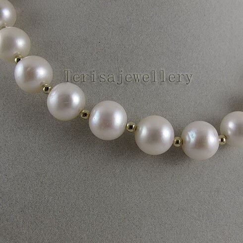 Terisa Pearljewelry Store AA 9-10MM White Genuine Freshwater Pearl 3mm Gold Beads Handmade Pearl Necklace Women Gift