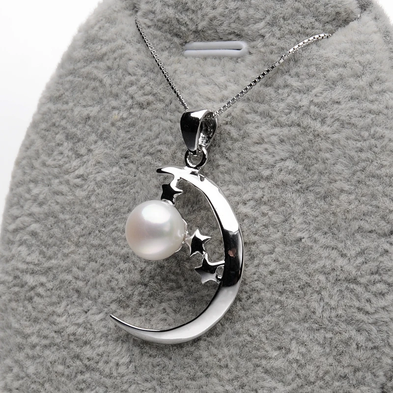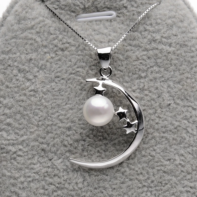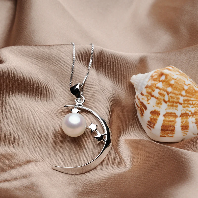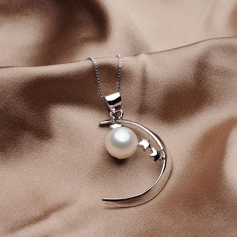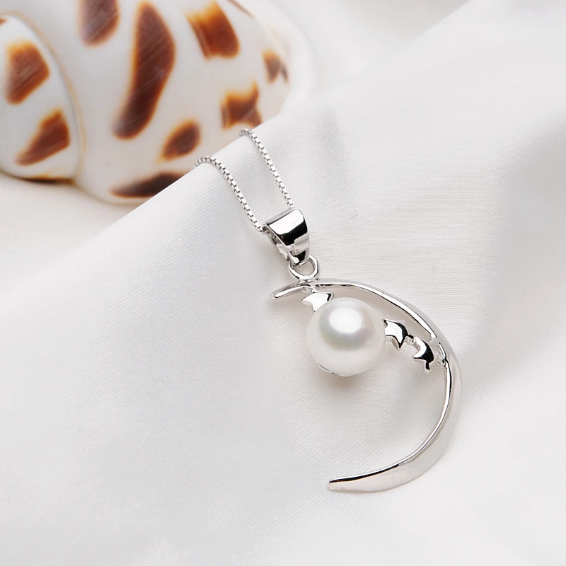 Moon shape 925 Sterling Silver Pearl Pendant Necklace 8-9MM White Pearl Necklace for Women Fine Jewelry Gifts FEIGE