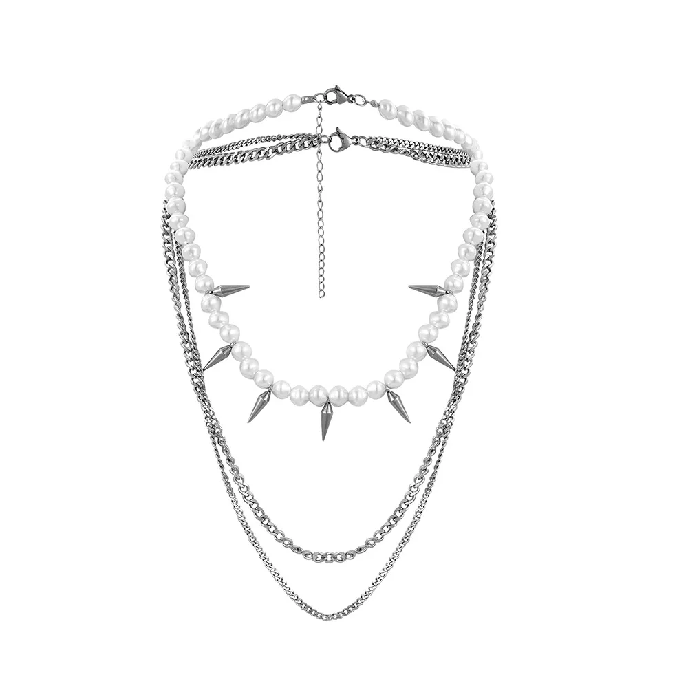 Three Layer Punk Rivet Pearl Beaded Choker Necklace Jewelry Men's Choker Necklace