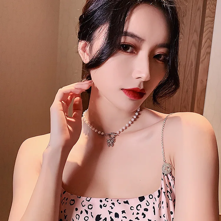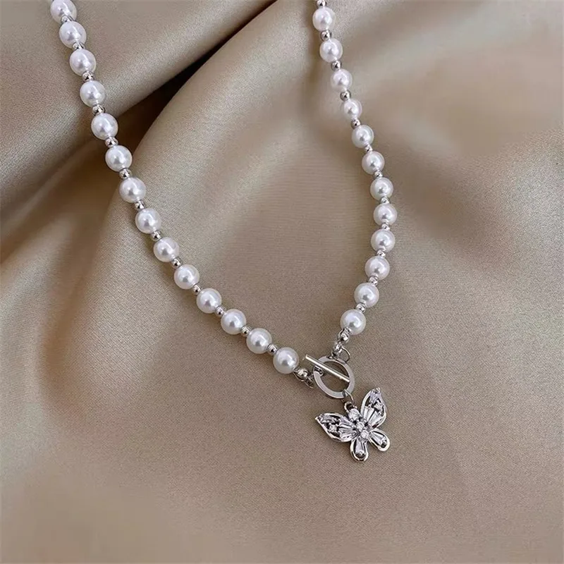 Toggle Clasp Imitation Pearl Choker Necklace Sweet Rhinestone Crystal Butterfly Pendant Necklace for Women Girl Gold Bead