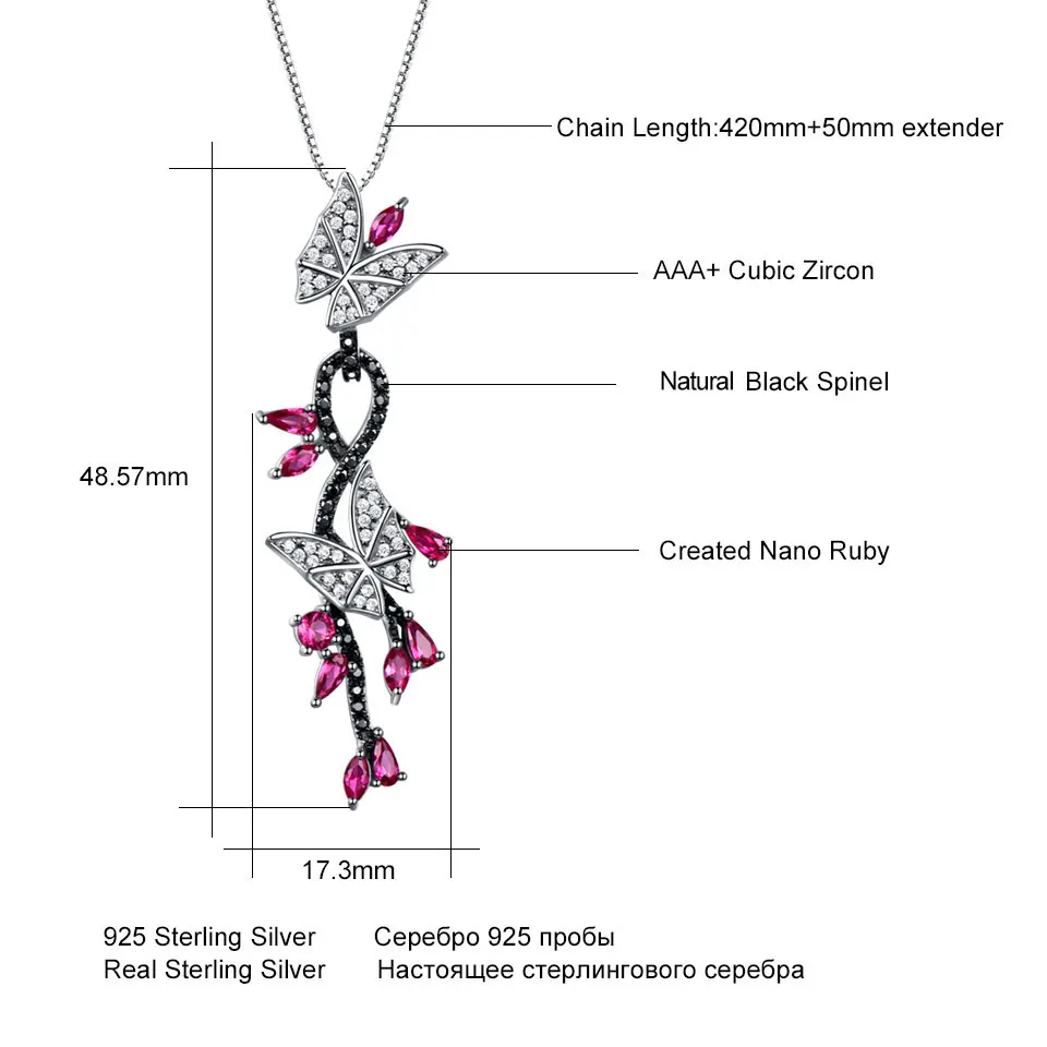 Solid 925 Sterling Silver Pendants Necklace Butterfly Created Ruby Gemstone Black Spinel With Chain For Women Fine Jewelry