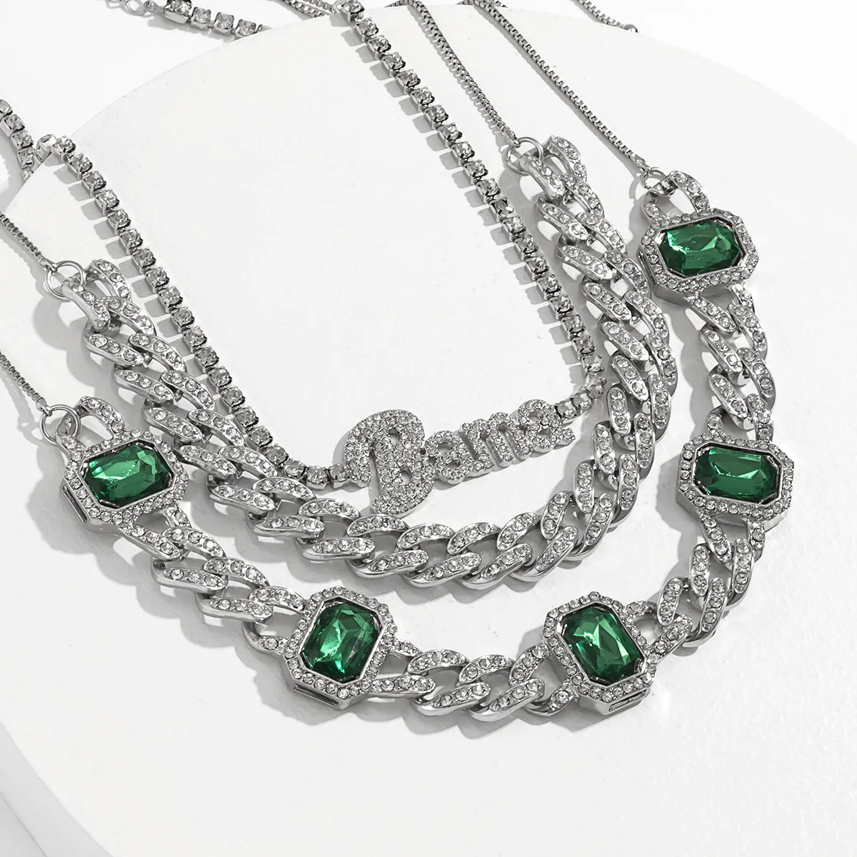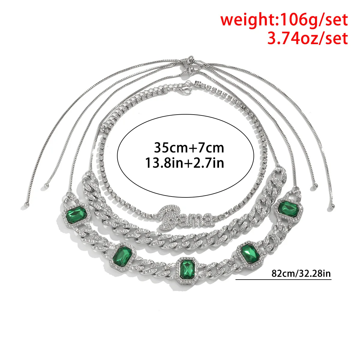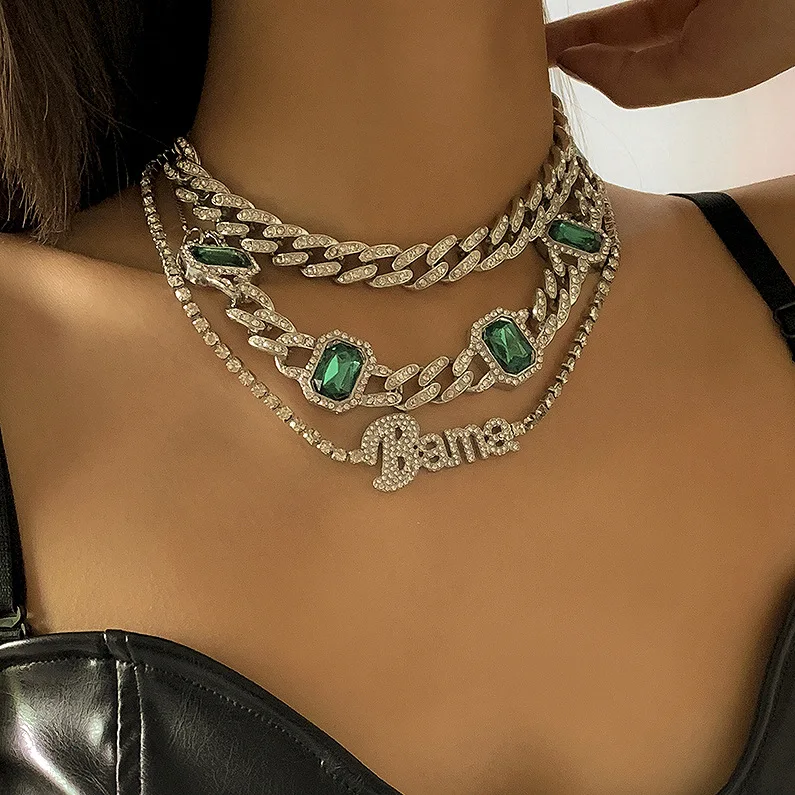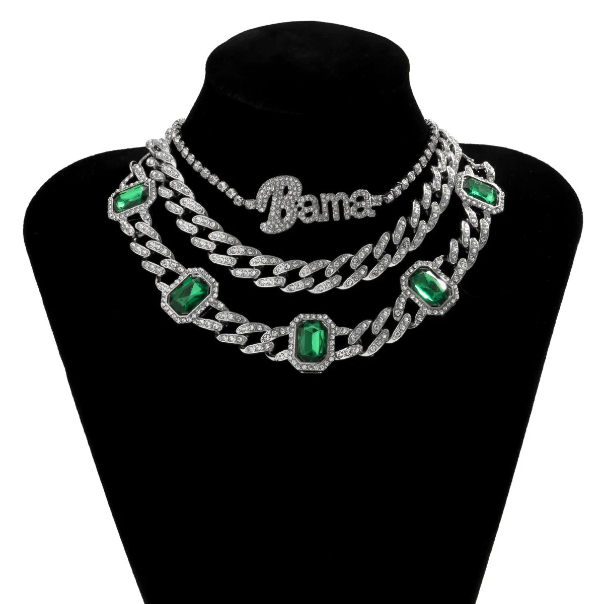 Upscale Luxurious Woman Cuba Necklace Multichamber Chokers Necklaces Green Hyperbole Letter Rhinestone Bama Party Gift