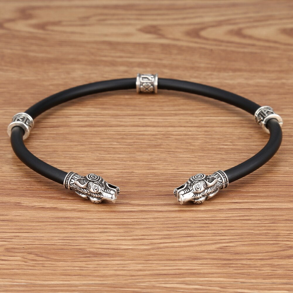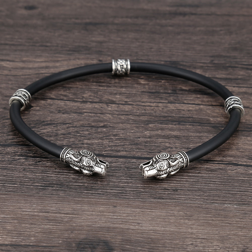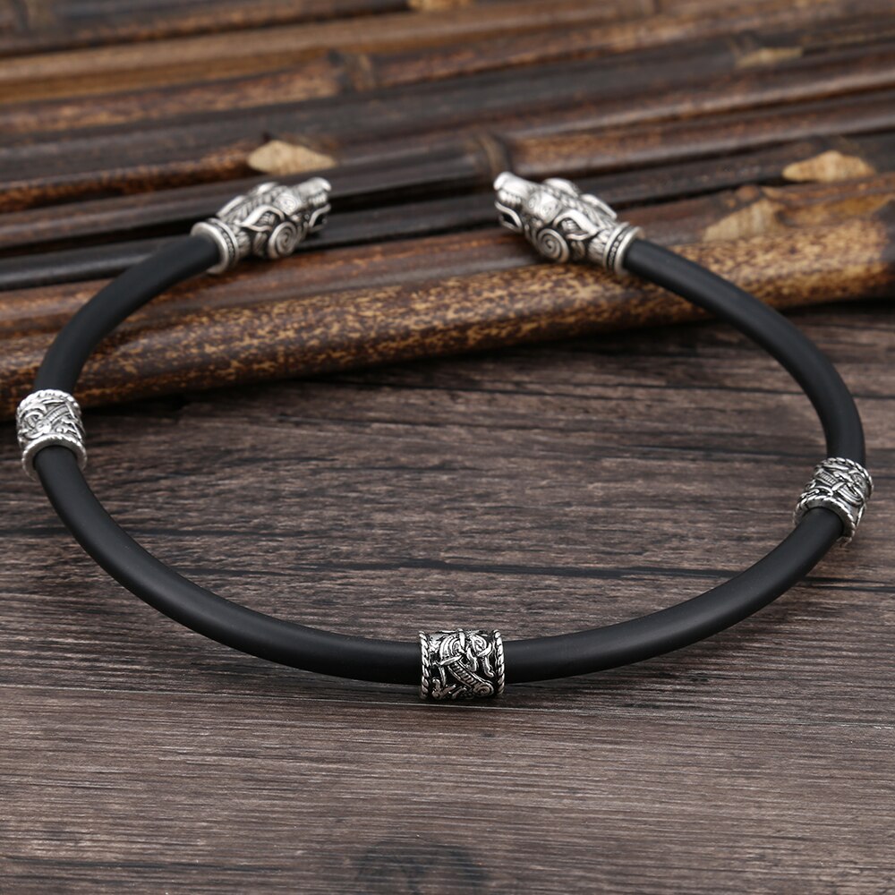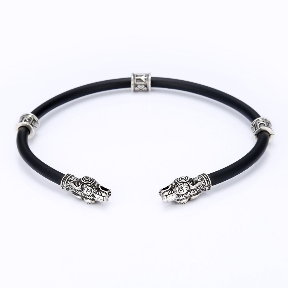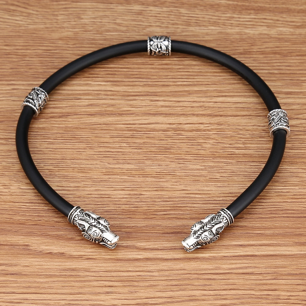Vikings Wolf Head Choker Necklace with 3 Viking Rune Beads Men's Torque Necklace Jewelry
