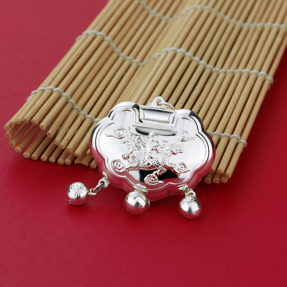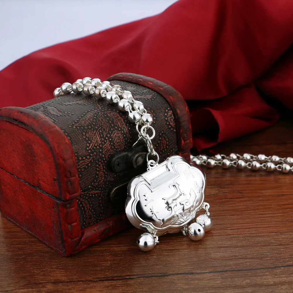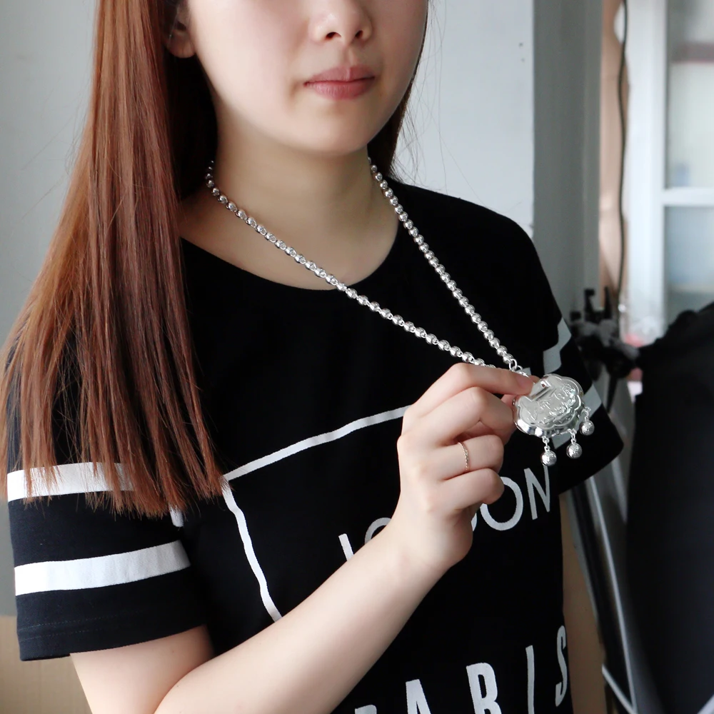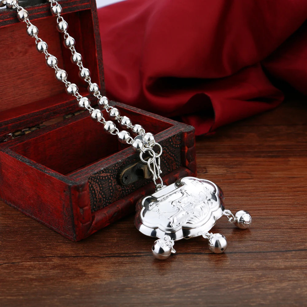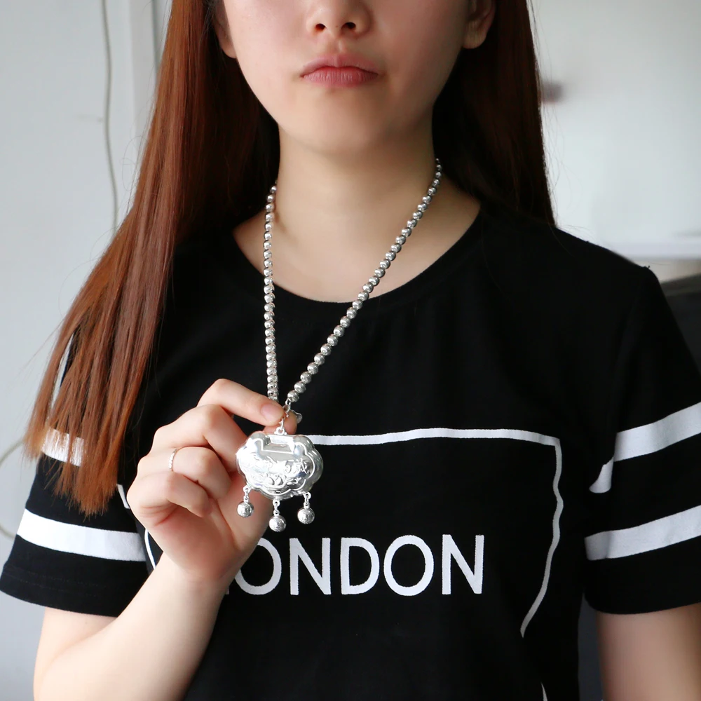 Vintage Ethnic Style Jewelry Women's 925 Sterling Silver 5-8MM Beads Chain Necklace Pattern Lock Pendant Sweater Chain 46-89CM