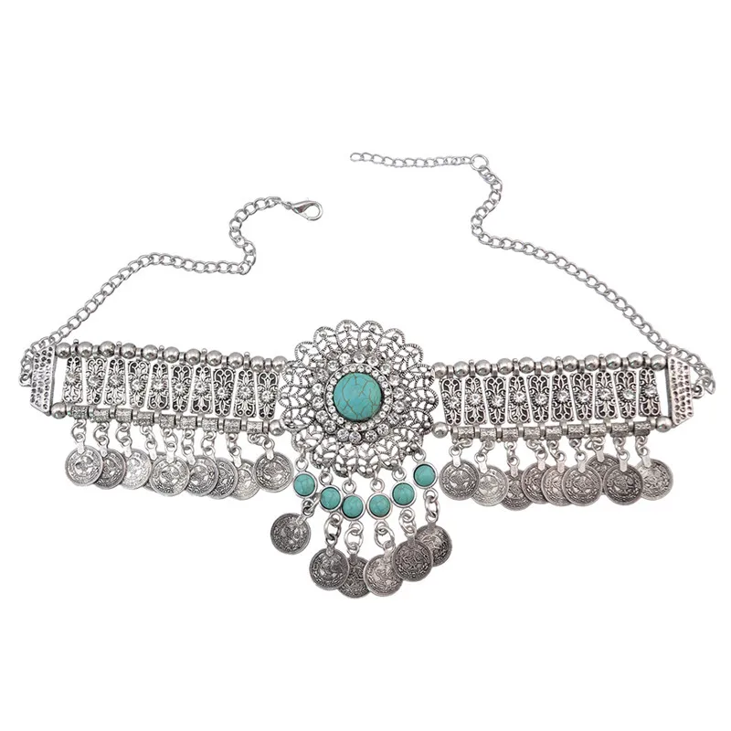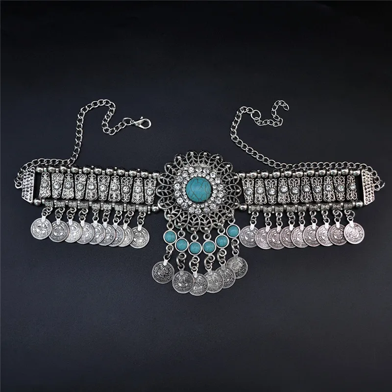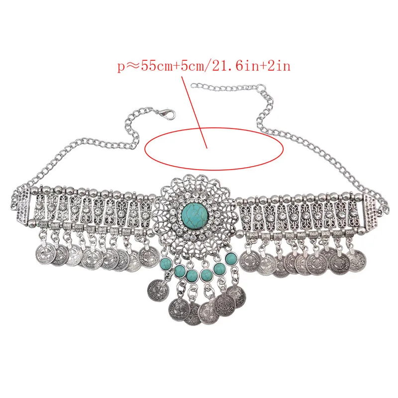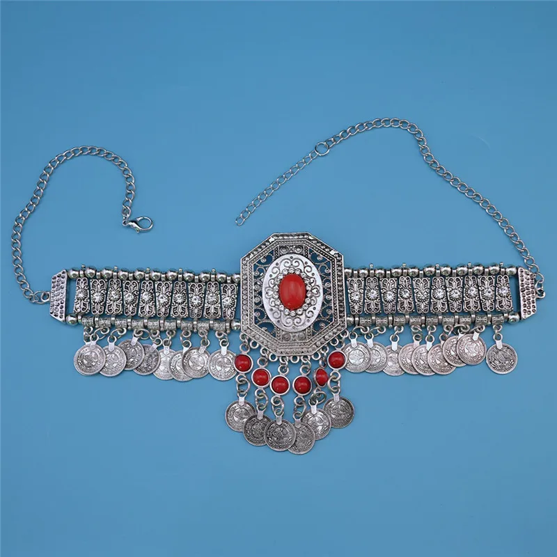 Vintage Green Stone Tassel Pendant Necklace Women Statement Necklace Exaggeration Coin Necklaces Jewelry Red Choker Women Choker