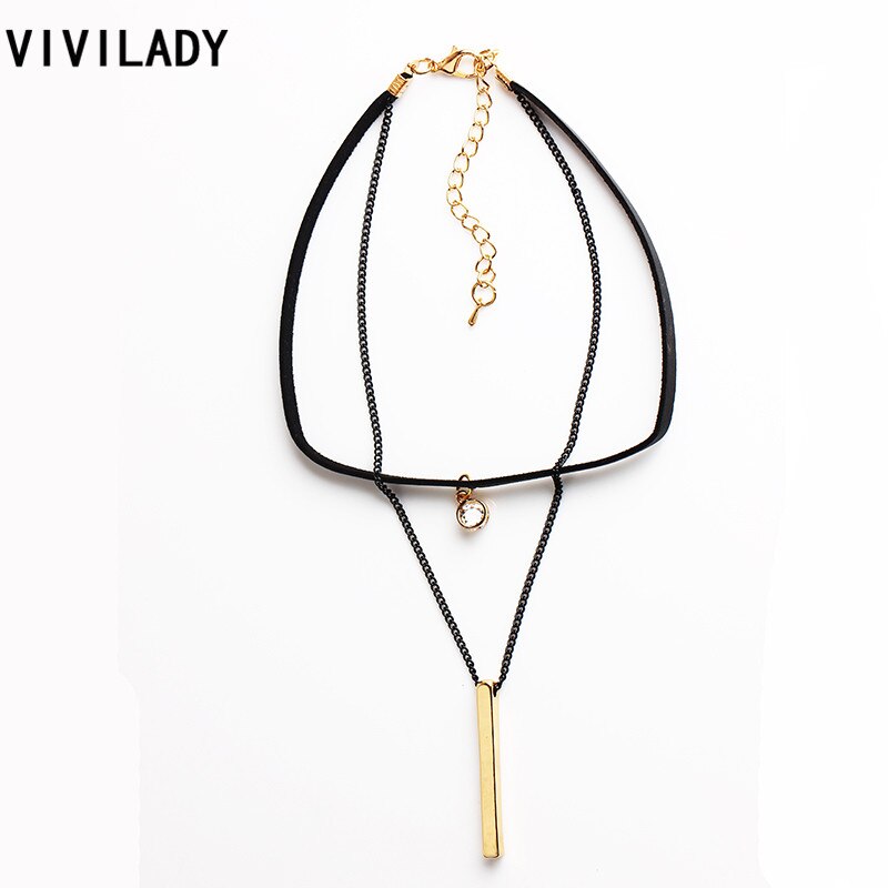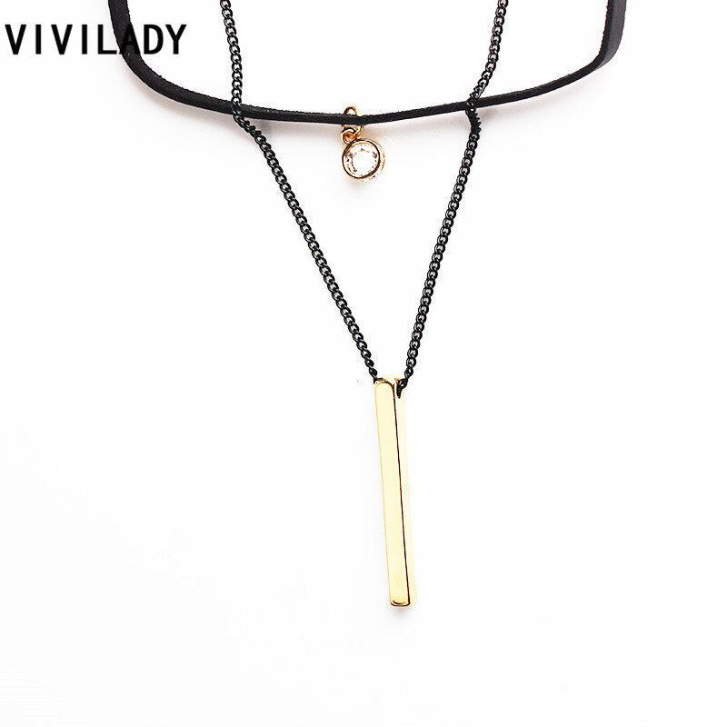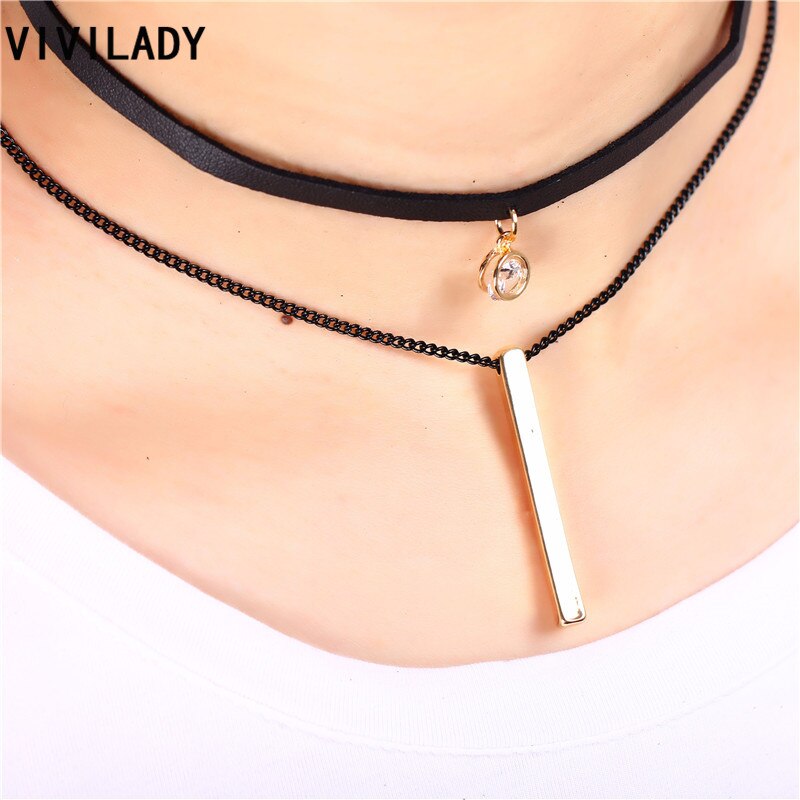 VIVILADY Alloy Two-layers Black Rope Crystal Geometric Cuboid Necklace for Women Girl Jewelry Gifts Bijoux Accessory